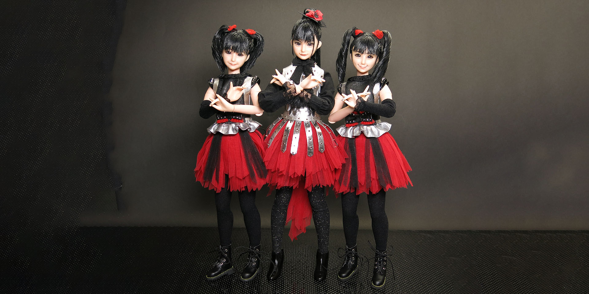せっかくなので前回撮れなかった「世界征服」のスリーショットも。熱心なファンの方々はお気づきでしょう。スクリーム担当のお二人のコスチュームがこのTV出演当時と微妙に違います。SU-METALを「IDZ」仕様にしたのでこの二人もそれに合わせたんですが、ドールの身長差で言うとお三方のバランスが幕張以降の感じなので。その時期の「IDZ」衣装と言えば・・・?