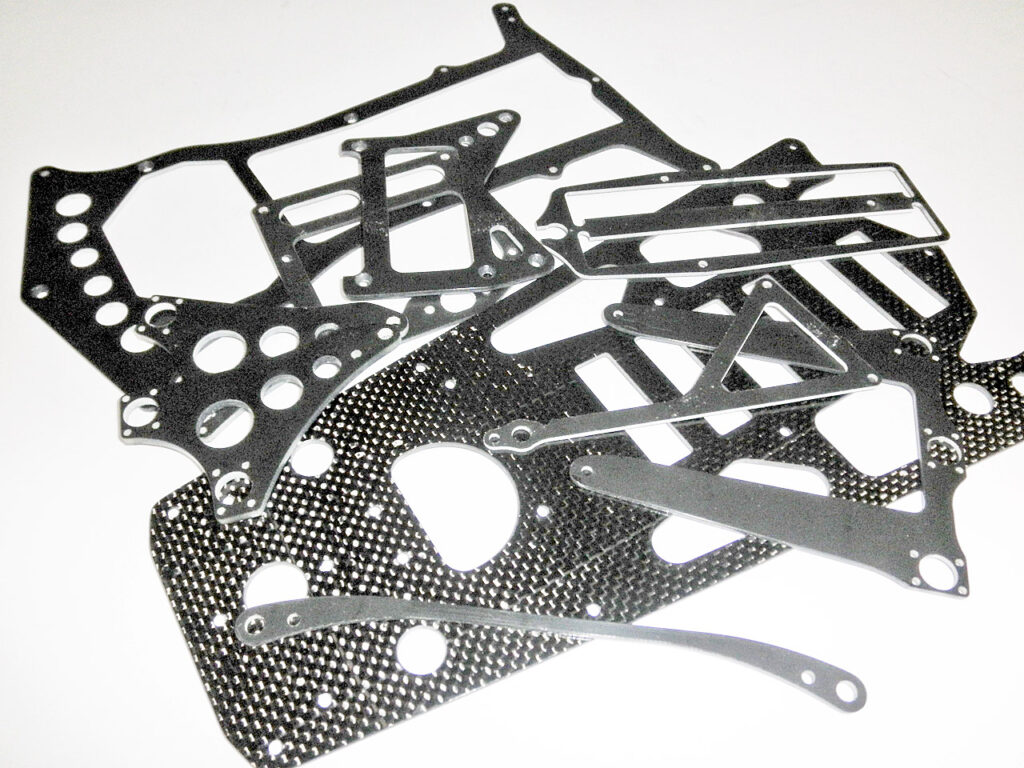 中身を確認して、さっそく組み立てていきます。 このキットは廉価版?なのでメインシャーシ以外の板物パーツはブラックFRPです。 全てオプションでカーボンパーツがあるようなので追々交換していきましょう。 それにしてもこの板の数! フチの面取りと瞬着コーティングだけでウンザリします(笑)。 面取り→瞬着コーティング→砥ぎ→コンパウンドの順で仕上げれば完璧です。 途中で飽きて(!)FRPの何枚かは未加工です。