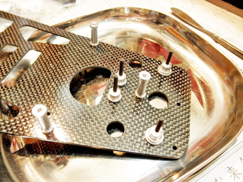 板物の下準備が出来たら組み立てに入ります。 パーツの加工精度が良いのでサクサクと進みます。 F/サスのマウントを組んだだけでカッコイイので写真撮ります(笑)。 カーボンプレートとアルミの組み合わせって、何度見てもカッコイイっす♪。