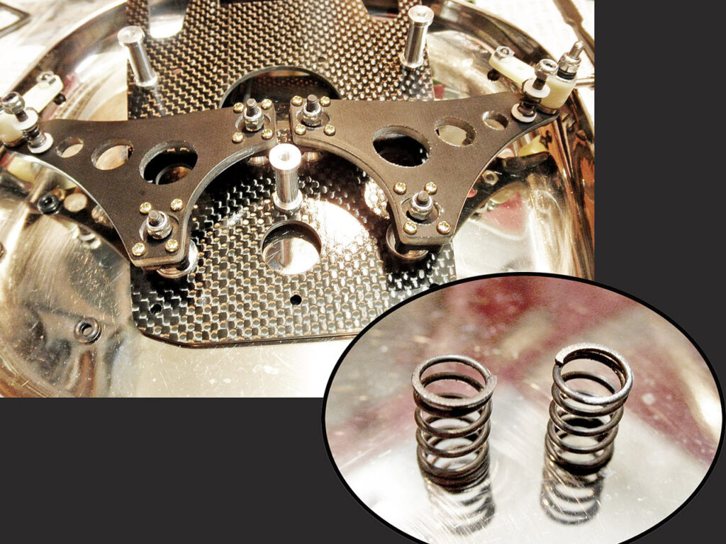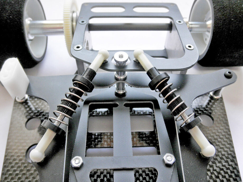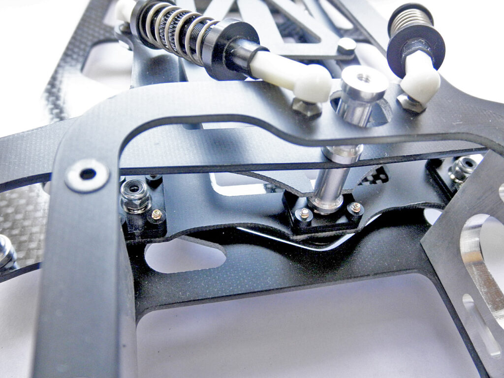 完成するとこうなります。 2本のコイルオーバーダンパーのみでポッドを制御するので、アソシ式のダンパーワッシャーはありません。アソシはダンパーワッシャーでポストが削れて段になったりダンパーグリスにベタベタにゴミが付いたりで、一見シンプルでも実は結構煩わしいッス。 そういう意味ではこの方がかえってシンプルかも。
