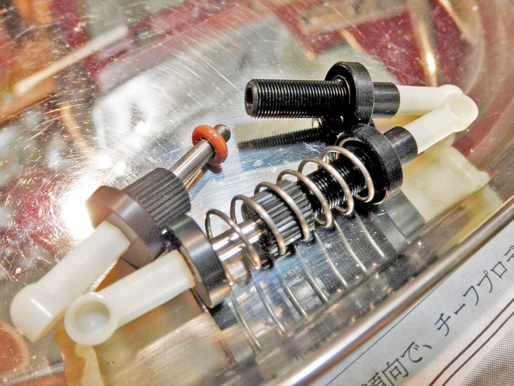 この車の「ウリ」のひとつ、2本のリアショック。 約60度の挟角でポッドを支えることでロール、ピッチの両方を制御します。 本体の黒パーツは全てジュラコンかナイロン製のようで、シリンダー外周に刻まれた極小ピッチのネジは切削加工されています。減衰力はたった1個のOリングのみで発生させますが、そこは流石ヨコモ。ちゃんと効いています。Oリングさえマメに交換すればオイル封入式の小型ダンパーより効果的かも? シリコンオイルを塗りながら組み立てます。