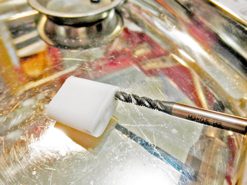 これはアッパーデッキに取り付けるジュラコン製のアンテナマウントベースです。M3ビス用の穴が小さくて締め込めないのでタップを立てます。 ネジ切りはビス長の2/3ぐらいで止めるのがポイント。 同じく前出のダンパーも、ボールエンドを固定するシリンダーの穴が小さかったのでこちらは接続用のホロービスを短い物に交換して対応しました。 今回、組み立て中に調整を要したのはこの2点だけでした(タミヤよりカンタンかも)。