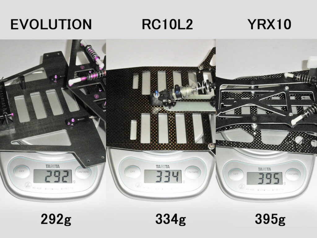 ついでに重さも比べてみます。タイヤ・ホイール、モーター等を外してほぼ同じ条件にしておきます。 やっぱりこのYRX10が一番重いです。 最軽量のEvoより100g!も重いッス! 10Lが妙に重いのは意外。 Evoはドライカーボンプレートなのでシャーシそのものが軽いようです。