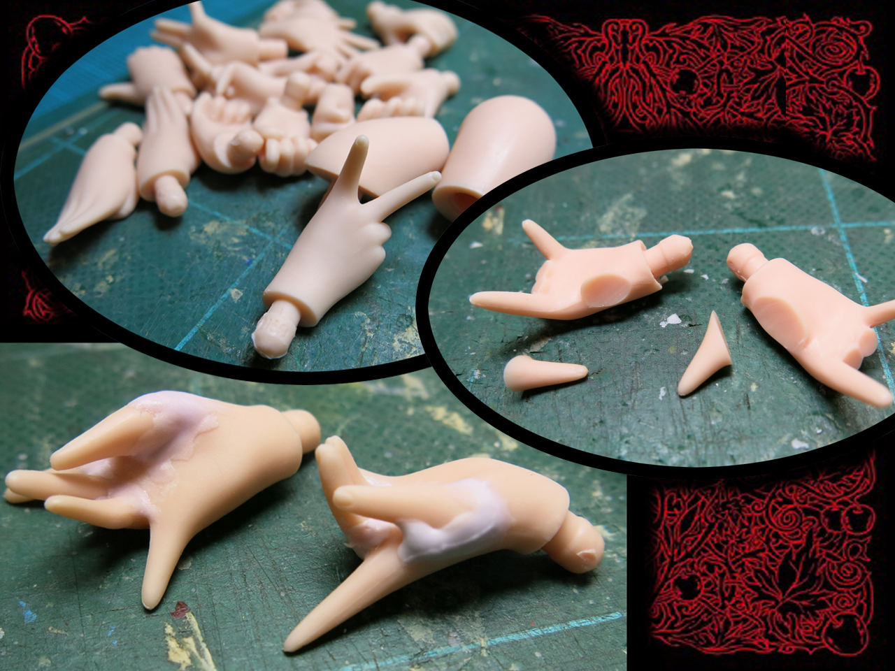 007 ドールカスタムへの道 BABYMETAL風 その5 BABYMETAL風ドール 2014.06.072025.04.15 ヘッド以外の部分のカスタム紹介も少々。まずはBABYMETALのトレードマーク、「キツネサイン」ハンドを作ります。このボディー用の差し替えハンドパーツセットを用意して、形状が近い物を選んで改造します。ソフビにも強力に食いつくクレオスの「瞬間接着パテ」で切り離した指を接着して「キツネ」の形にします。