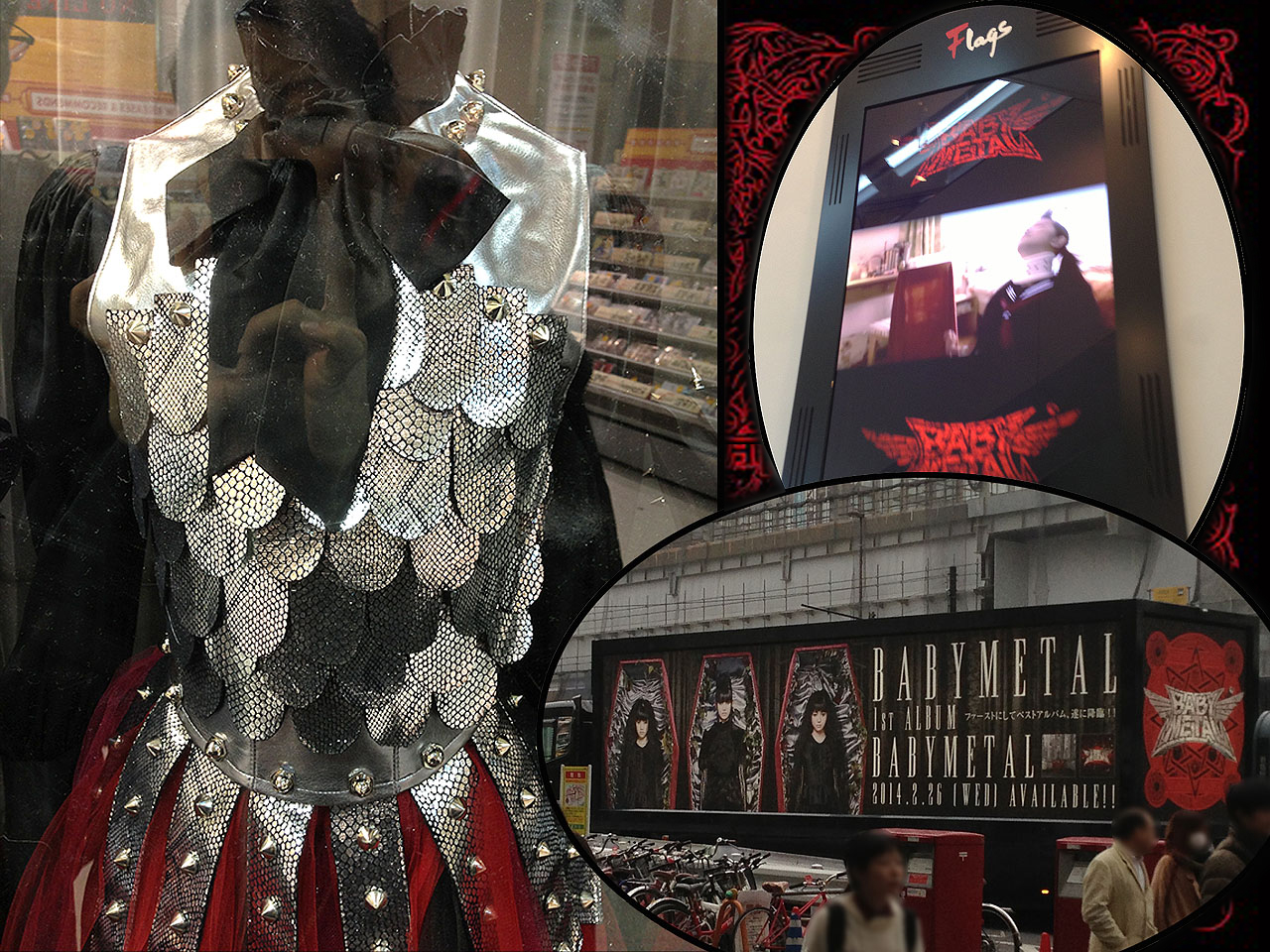 3月1日、ライブ当日。九段下に行く前にちょっと寄り道を。タワレコ各店で、武道館の4日前に発売された1stアルバムの販促イベント「BABYMETAL衣装展」をやってるそうなので。この新宿フラッグス店にはイジメ・ダメ・ゼッタイの「Mステスペシャル」バージョンが。ちょっとした企みに備えてディティールもしっかり撮影。へえぇ、こんな素材なんだ。フラッグスの館内広告でもBABYMETALのMVが。店の前の甲州街道で偶然、1stアルバムの宣伝トラックに遭遇♪