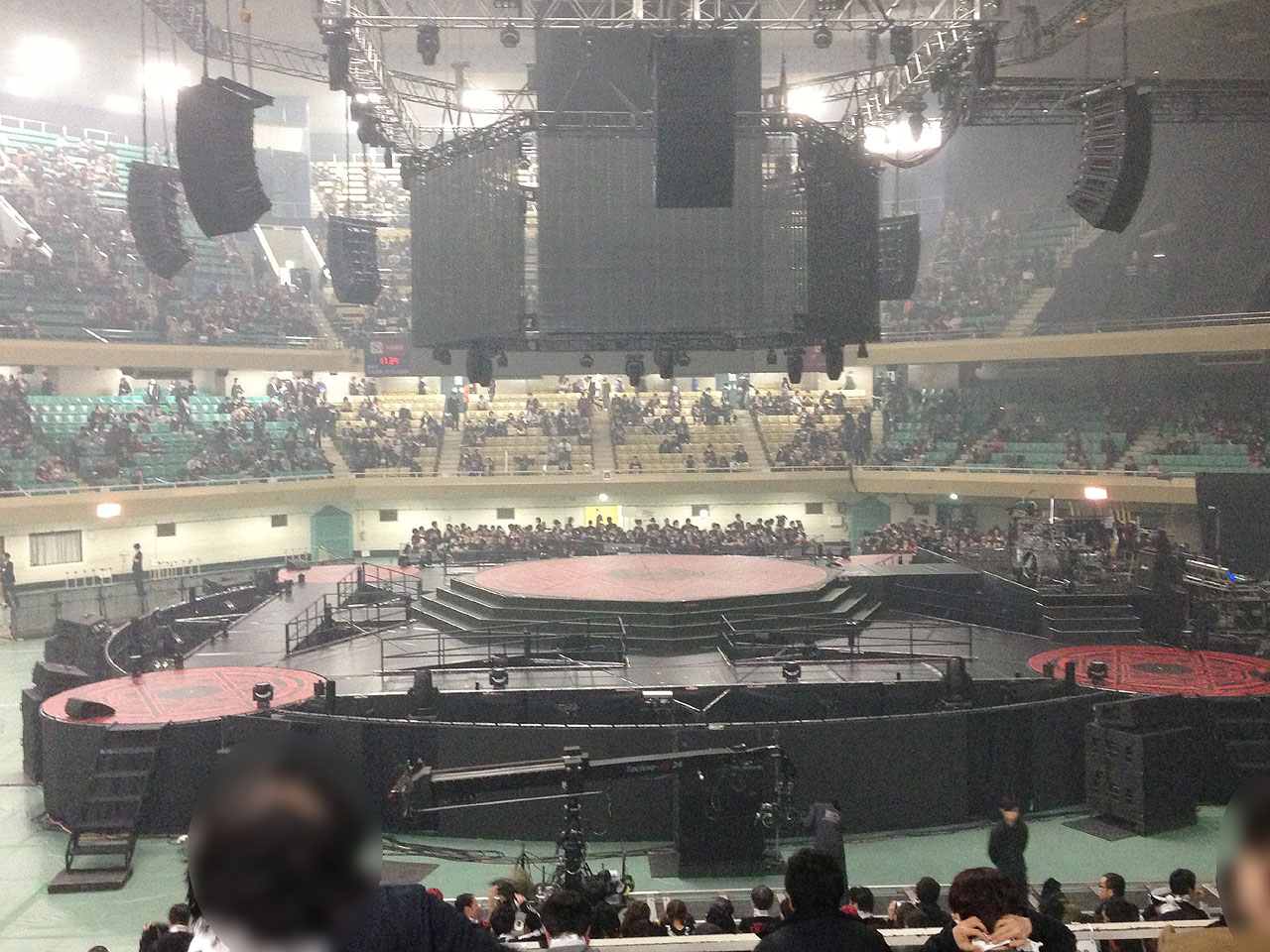 物販では武道館限定TシャツとDVDセット、新デザインのタオルとリストバンドを購入(マズイ、結局また色々買っちまった・・・)。定刻よりかなり押して入場開始。中に入ってビックリ、まさかのセンターステージ!日の丸の下に6面のスクリーン吊って更にその外周に放射状に7個のスピーカー。なんかスゲぇ気合入ってるんですけど。