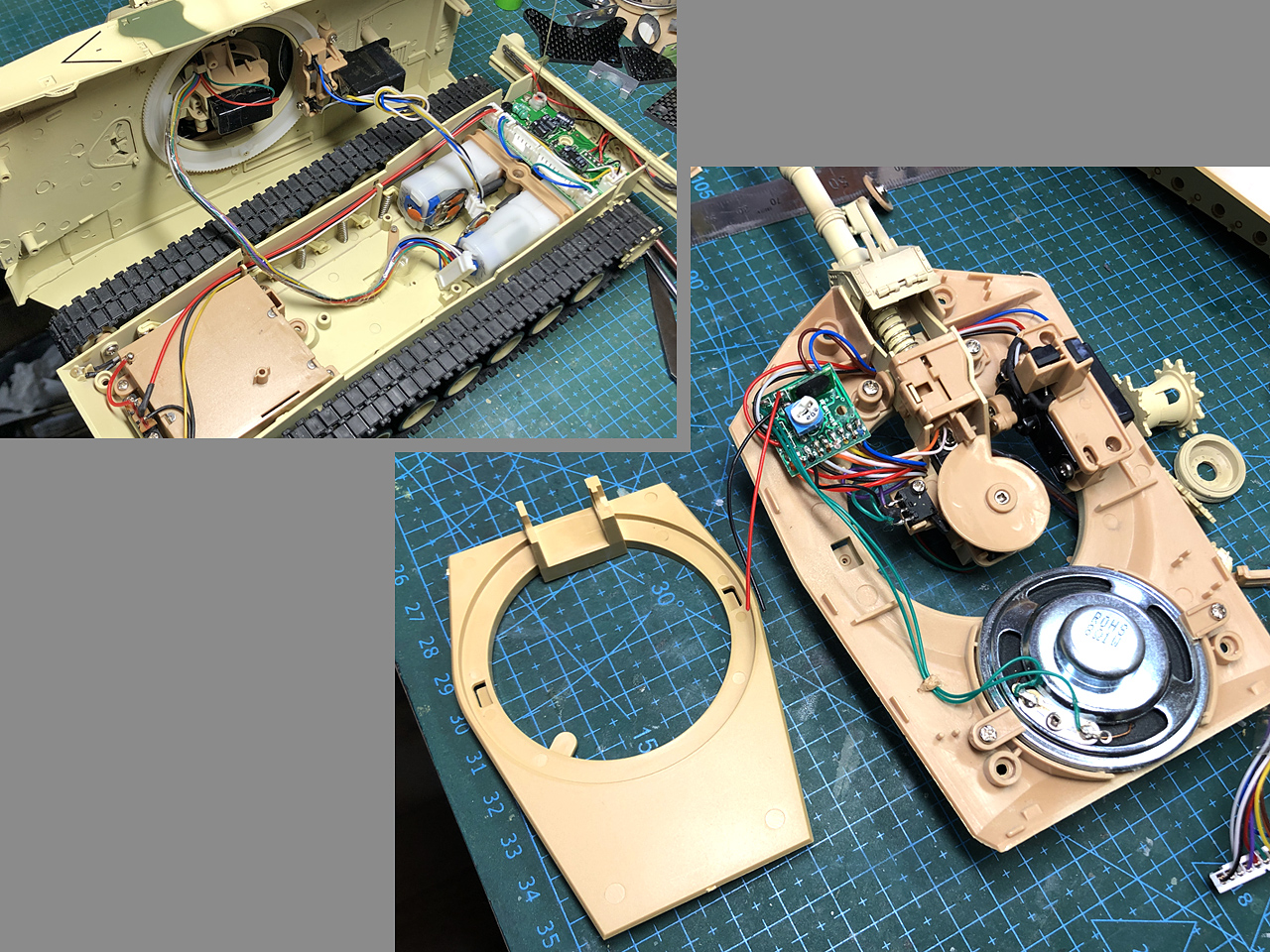 タミヤの戦車専用設計のRCユニットと比べると、全て汎用サーボで別々に動かす旧式構造なのでその構成部品がゴチャゴチャとかさ張ります。