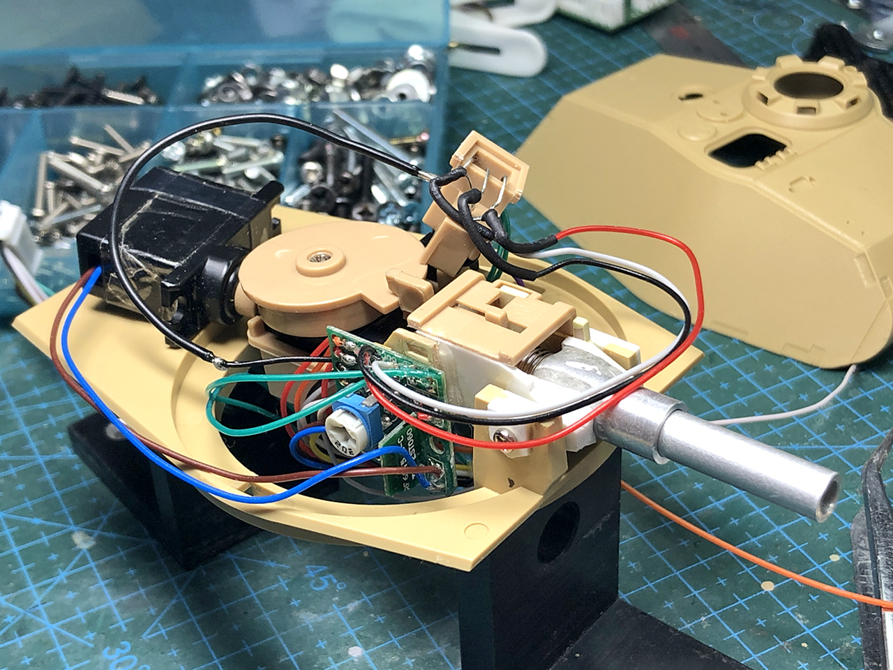 電子基板は唯一の空きスペースになる砲身右側に移動、垂直に立ててビス止めしてしまいます。