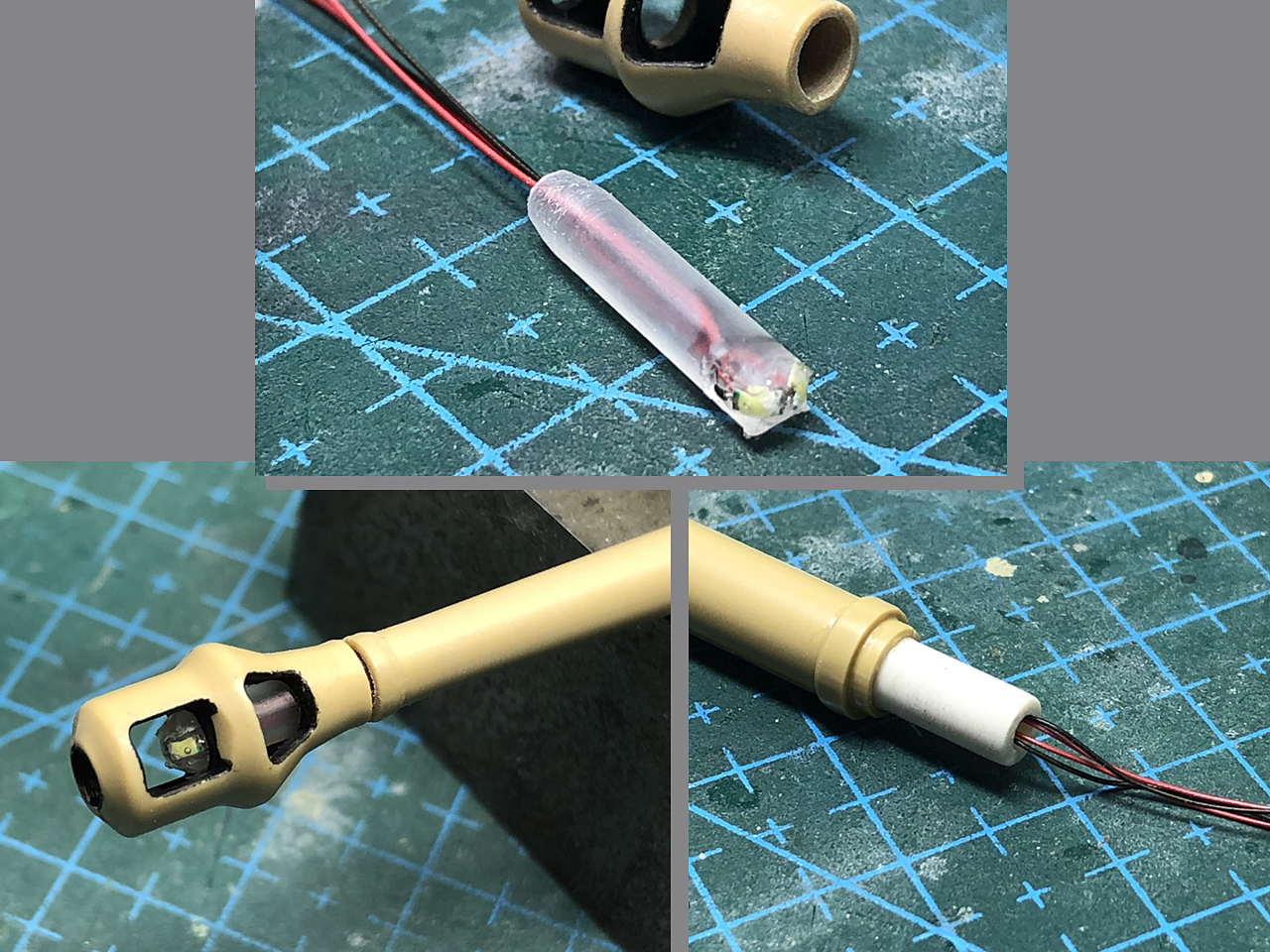 コイツもいまいち暗いので2個をハの字に並べて接着、切込みを入れたビニールパイプの先端に固定してマズルブレーキに仕込みます。