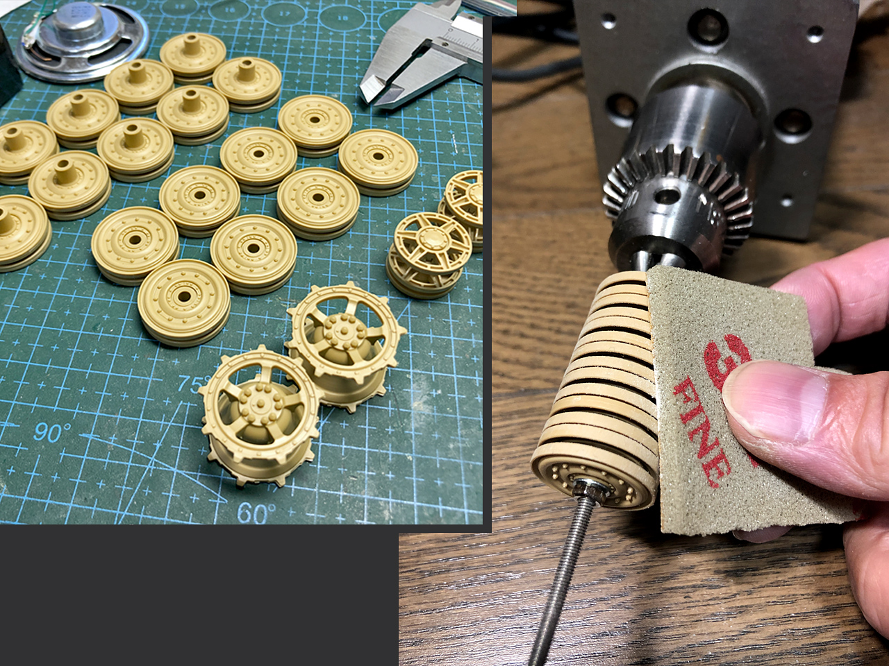 M3の全ネジシャフトに転輪をまとめて通して固定、ドリルで回しながらヤスリを当てます。
