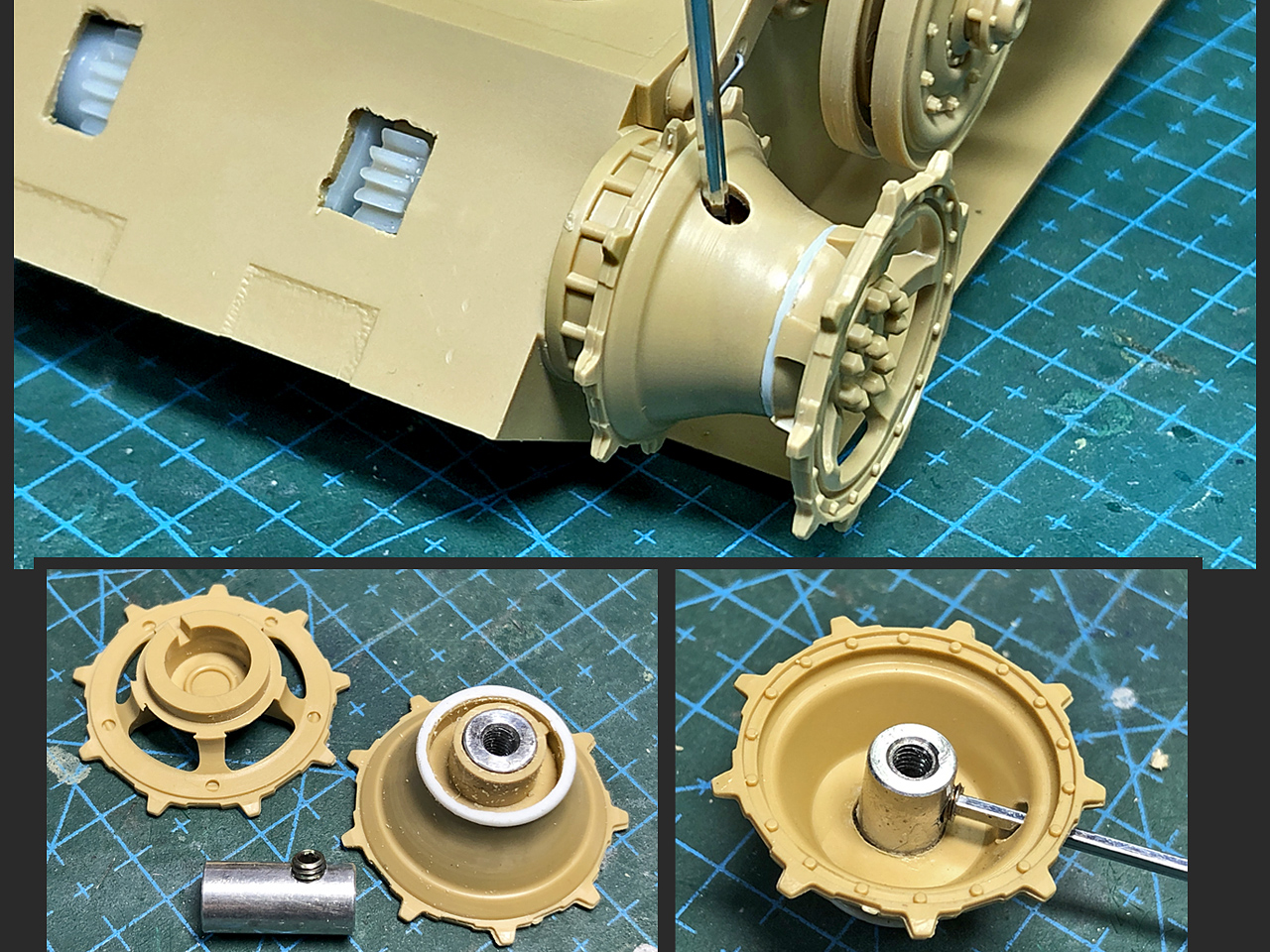 さらにギアボックスの出力軸に固定するためのハブを追加します。ココは重い金属履帯ごと車体を引っ張るトルクが掛かるので、ハブはアルミパイプで頑丈に作ります。キットパーツの穴を開け直してパイプを圧入、瞬着で固定します。出力軸には元々「回り止め」のDカット加工がしてあるので、ここにイモネジで固定するための穴をパイプに開けてネジを切っておきます。ただしそのままでは六角レンチを差し込むスキマがないので、スプロケットパーツにも穴を開けて対策します。