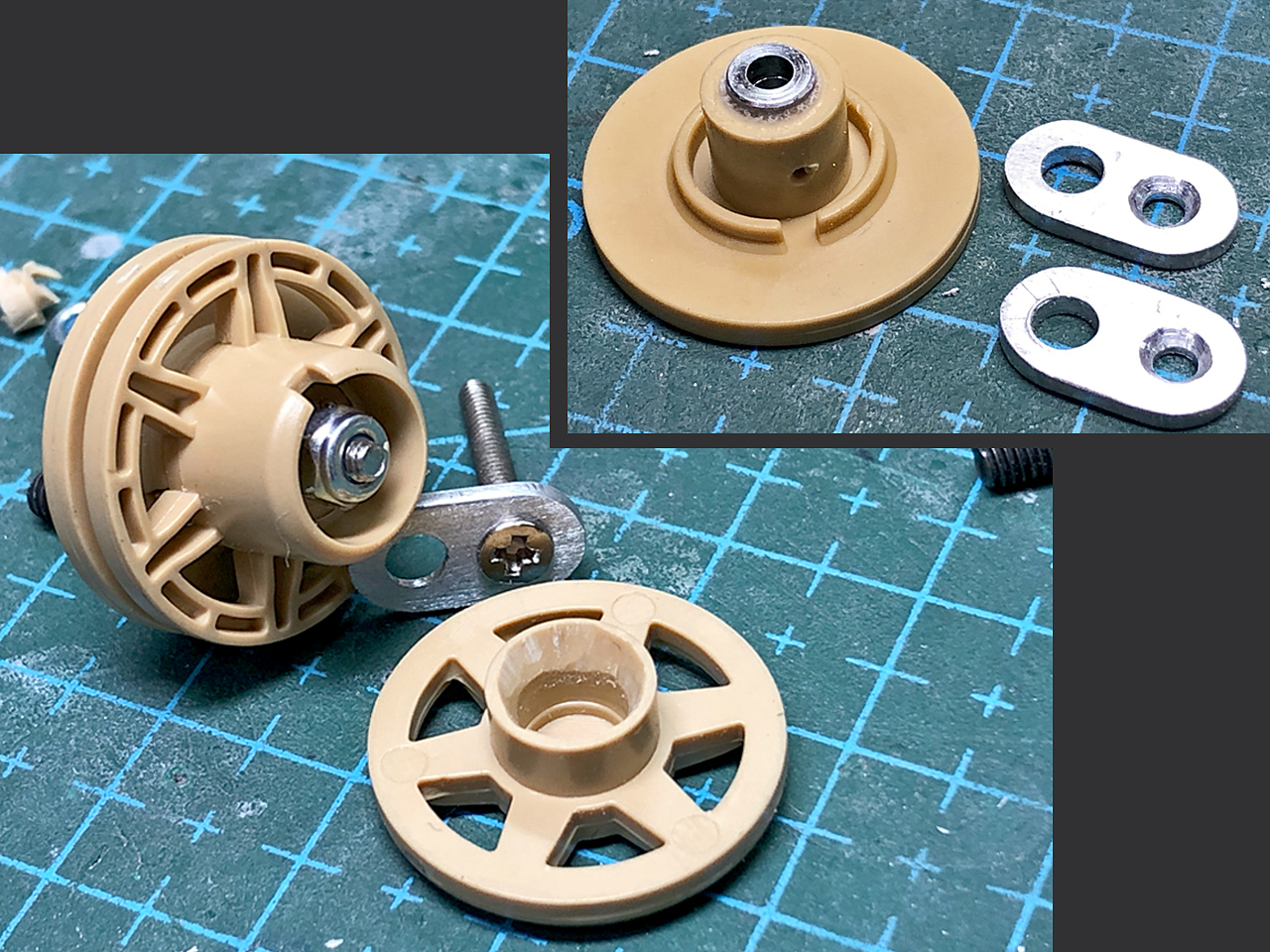 そこで、0.5mmのプラバンからリングを切り出してスプロケットの左右パーツに挟みます。