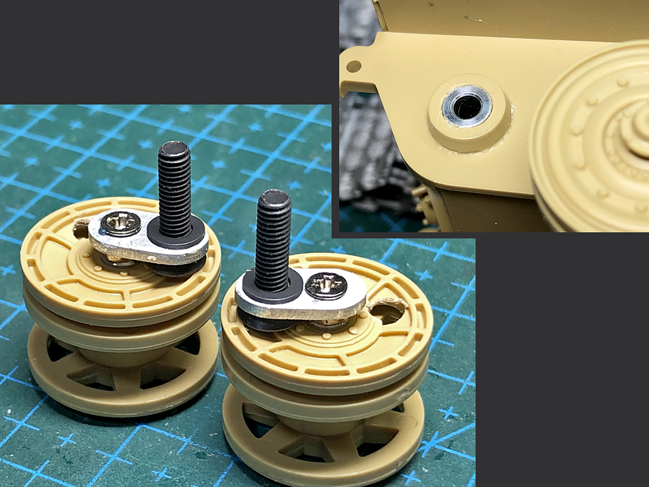左右のロードホイールの一番前と後ろの四か所は、スイングアームにやや強く角度が付く様にして履帯を装着した時の張力に負けない様にします。