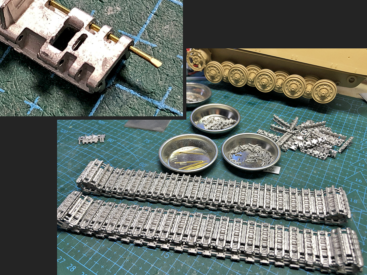 ただ元々パーツの精度はイイので、下準備の後の組み立て自体はサクサクと進みます。さらに連結ピン先端を加工しておいたおかげで、組み立て中に瞬着固定の必要がありません。1輌分180コマが約4時間で完成しました。ちなみに完成後に余った履帯パーツは約20組分、成形不良で使えなかったパーツはたったの3個!マスタークラブ、すげぇ。金属履帯の組み立てがクセになりそうです。