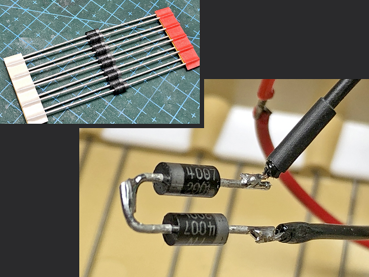 電流値とか良く分からないので、テキトーに4007二個をスイッチコードの途中に入れて試してみます。