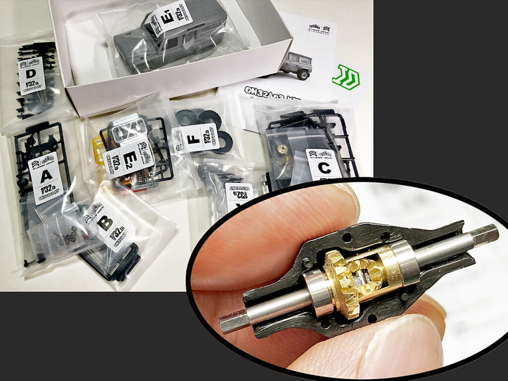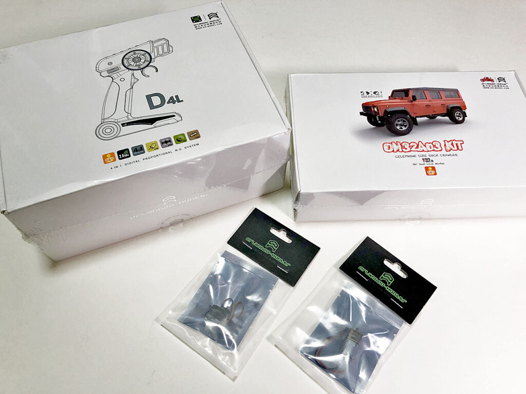 これは中国製の1/32ラジコン組み立てキット、オーランド・ハンター(ORLANDOO-HUNTER)です。フルアクションのRCカーでライト点灯やエンジン音も再現できる精密モデルです。21年の始めに中国のショッピングサイト「Banggood」で購入。いくつかのバリエーションの中からローバーの「ディフェンダー」っぽい(笑)モデルを選択。専用のプロポセットやモーターも一緒に。
