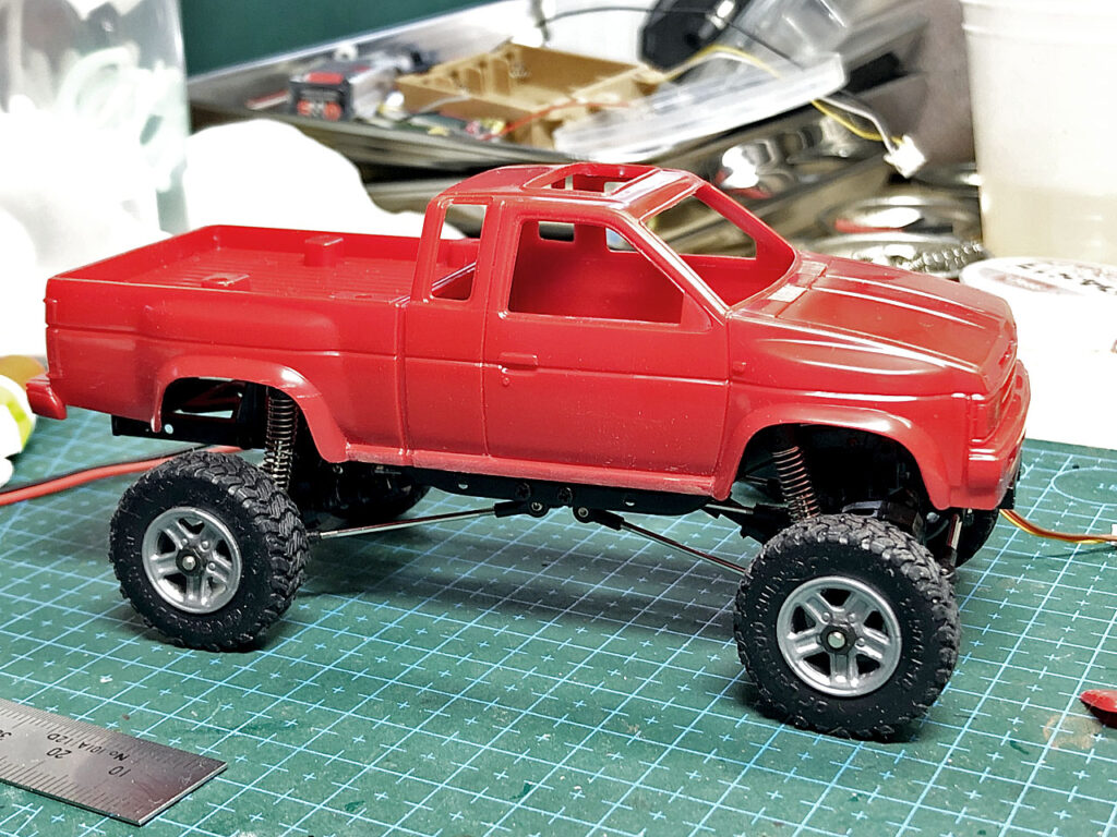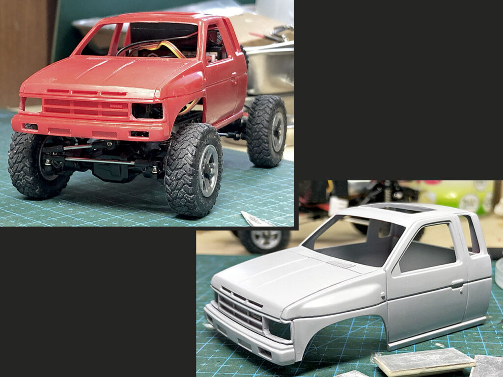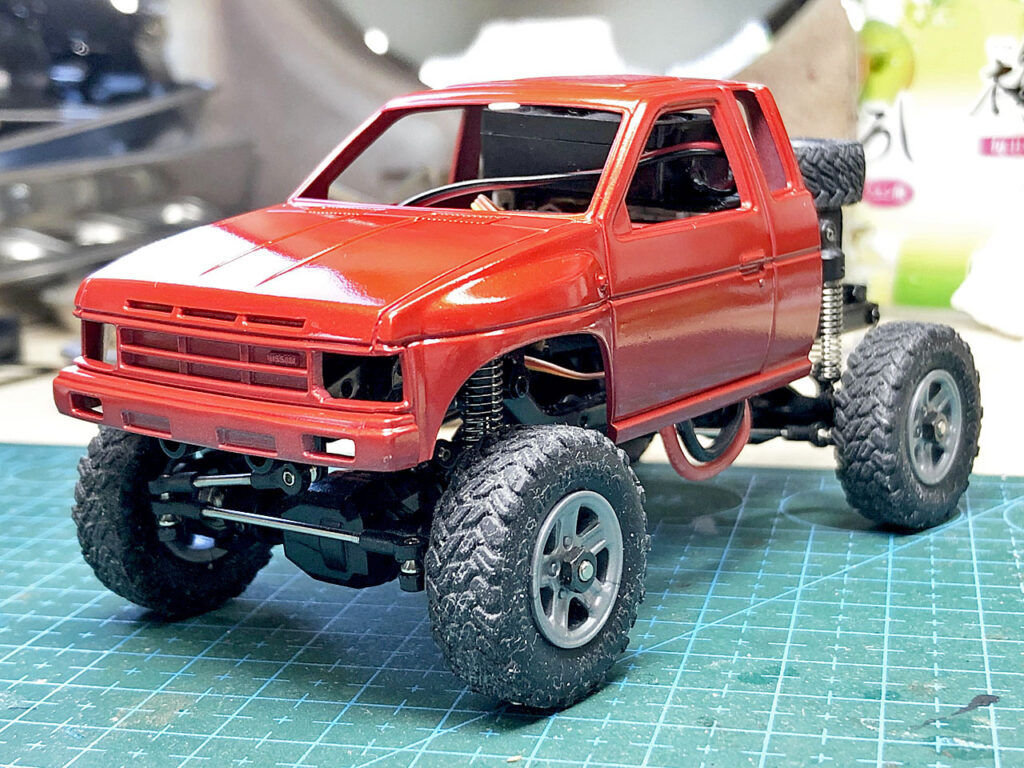 電池ボックスの寸法に合わせてキャビン後部を切り取り、整形したらボディーを塗装します。ワタシ的にはこのキングキャブ「D21型」はワインレッド系の赤のイメージが強いです。そこで下地にタミヤのレーシングホワイトを吹いた後同じくブライトレッドを吹いて研ぎ出しします。さらにこの上からクリヤーレッドにパールを混ぜた塗料をブラシで吹いてみました。
