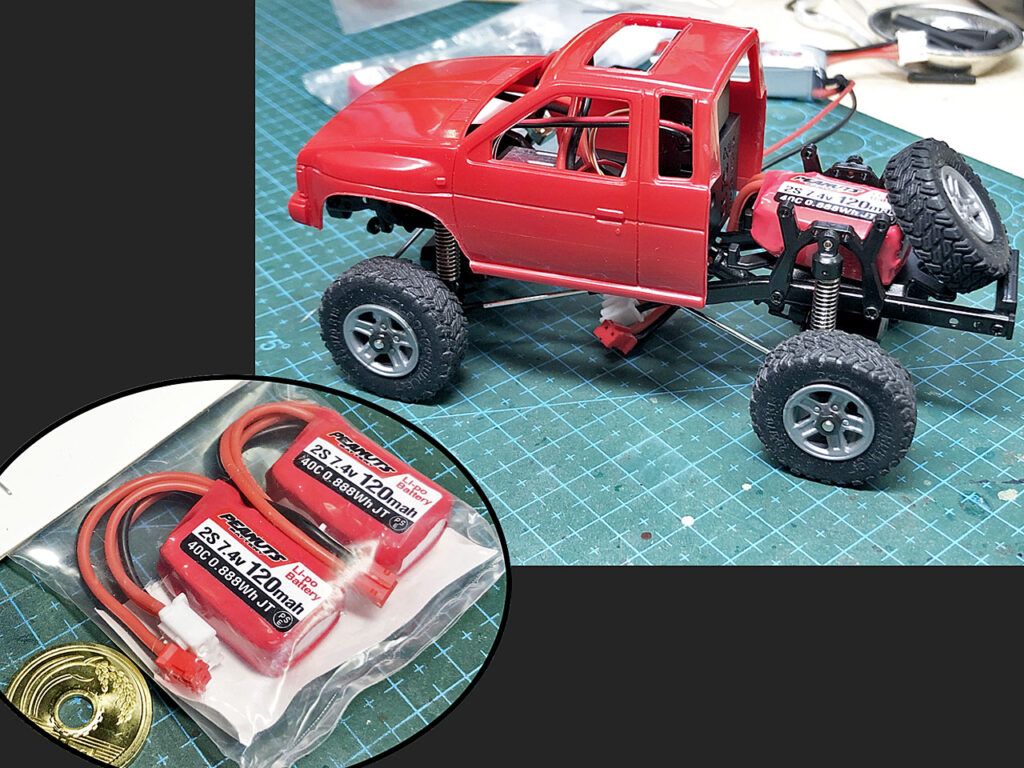 このキット。小さいくせに色々とリアルな作りなので、運転席回りのインテリアも作り込む予定です。そうなるとバッテリーのスペースはキャビンの後ろ、リアアクスルの上しかありません。が。ココにバッテリーが見えてしまうと急にオモチャっぽくなってカッコ悪いので、せめて最小のバッテリーを探してみます。それで見つけたのがコレ。120mahで2セル7.4v40cのリポ、しかもバランスコネクターが付いた本格派。