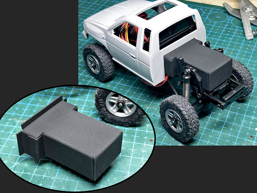 この作業と並行して車体後部に搭載するバッテリーを隠す為の「電池ボックス」も作っていきます。本来存在しないはずのこのパーツはなるべく薄くコンパクトに作ってボリュームを小さくしたいです。なので0.3mm厚の塩ビ板を「のりしろ」込みで切り出して折り曲げ、塩ビ専用の溶剤系の接着剤で組み立てました。完成したらやはり塩ビ専用の「Vカラー」のマットブラックで塗装しておきます。