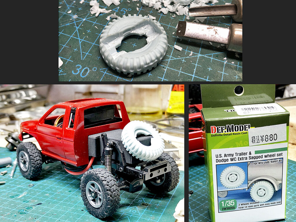電池ボックスが丸見えだとカッコ悪いのでスペアタイヤを載せて隠します。秋葉のプラモ系ショップを回って色々探して、何となく使えそうなコイツを購入。1/35ミリタリープラモ用のカスタムパーツです。裏側を加工して電池ボックス後部に被せてみると、「タイヤパターンがまるで違うな」。・・・荷台をブッた切ったキャビンを車体に載せた時から気になっていたんですが。「そもそもタイヤがちっちゃくね?」