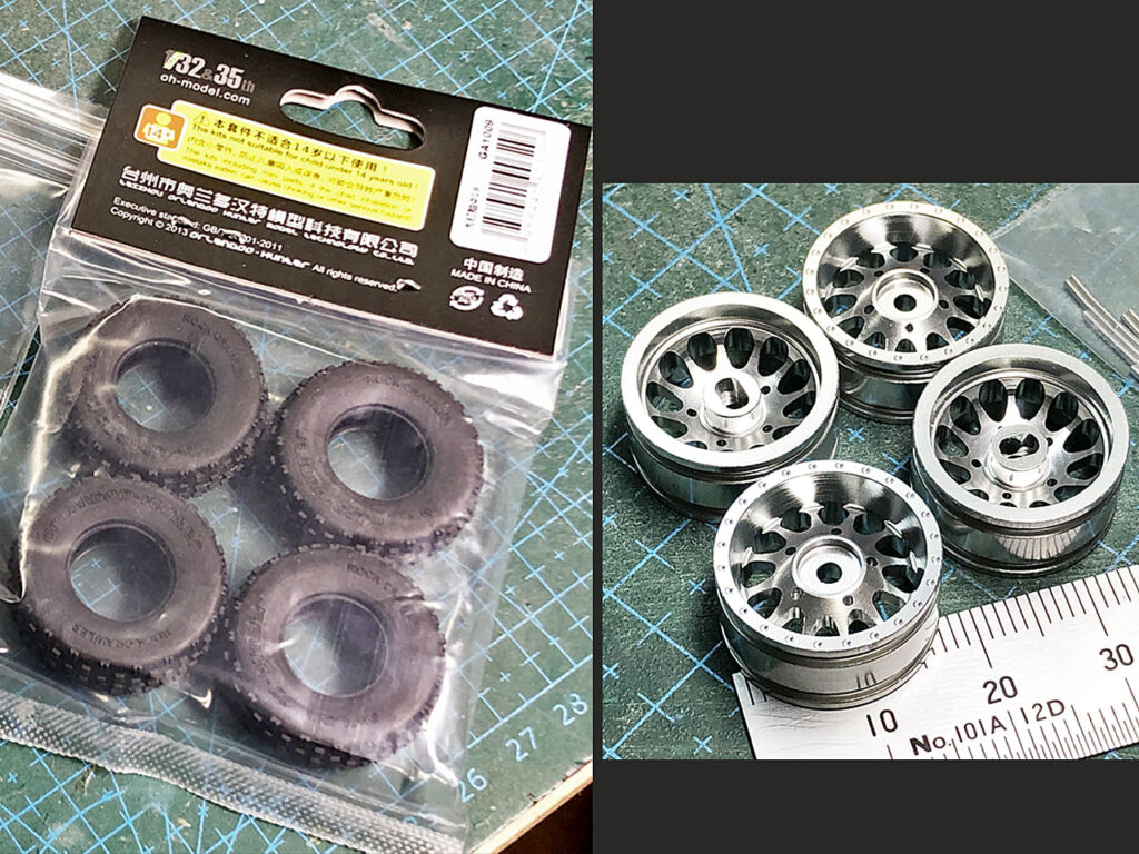 そこでこの組み立てキットのメーカーが売っている別のモデル用の一回り大きいアルミ製ホイールとクローリング用タイヤを購入。ホイールはもっとスポーティーなデザインのヤツが欲しかったんですが、コイツの径が一番大きいみたいなので。