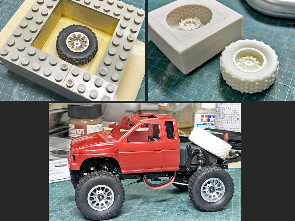 さっそく交換してみます。おお~っ、クローラーっぽいっス♪ついでに後ろに積むスペア用にコレを型取りして複製します。この複製タイヤ、外径・幅ともにずいぶん大きくなったので電池ボックスを覆い隠す範囲が広がってイイ感じです。
