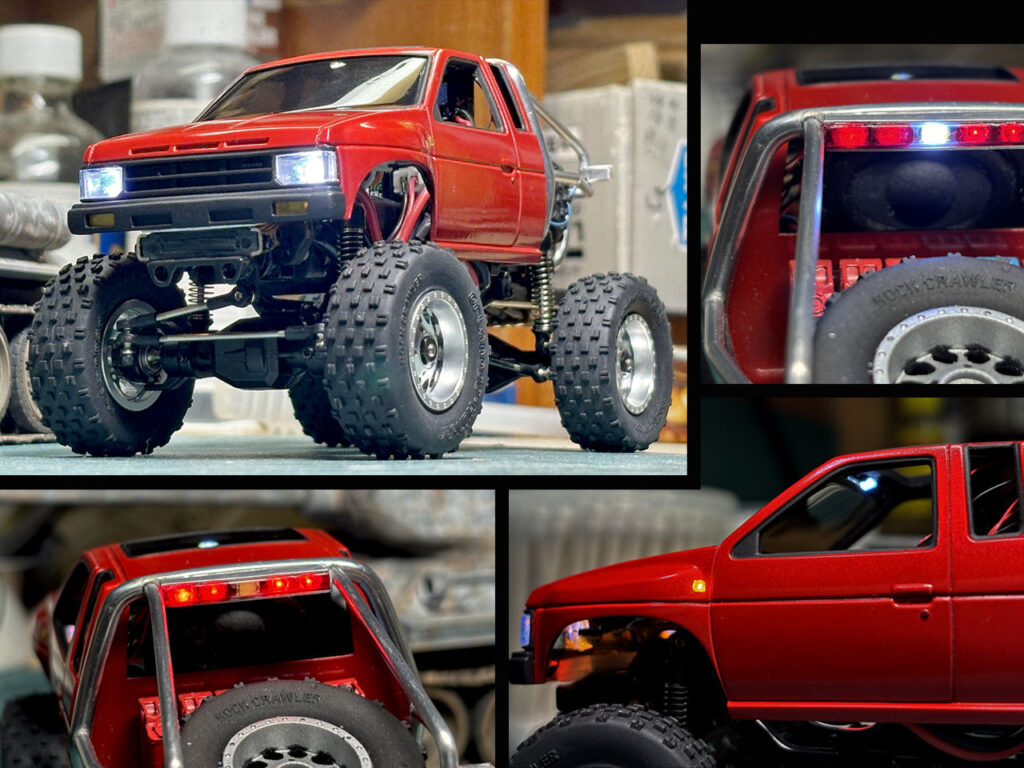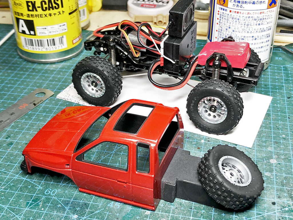 このキットはもともとマイクロサイズのロッククローラーというのがコンセプトのようです。なので当然4輪駆動です。ワタシは「4輪駆動」といえばタイヤが大きいピックアップトラックのイメージが強いです。そこで、このモデルもボディーをピックアップトラックに交換して室内クローラーにしてみます。選んだボディーはサイズもドンピシャなタミヤミニ4駆用「ニッサンキングキャブJr」。