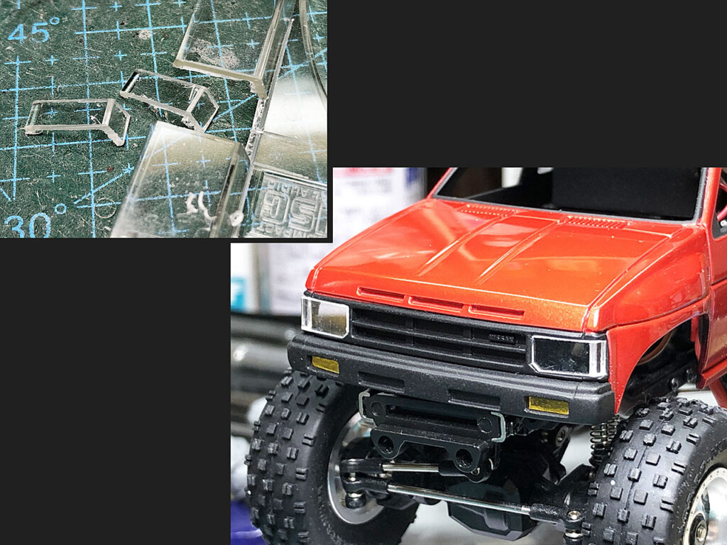 開口したライトやウインカー部分にアウターレンズパーツを入れていきます。ヘッドランプはボディーのカドを回り込んだデザインなので、懐かし?の「CDケース」の背中部分から切り出してコレを表現します。バンパー部のウインカーレンズも同様に切り出してクリヤー系のラッカーで塗装してそれらしくしてあります。