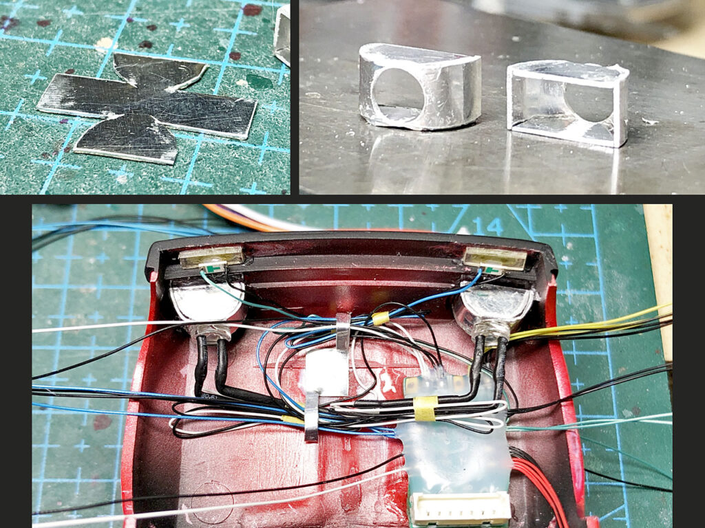 まずはヘッドライトから。0.3mmのアルミ板からリフレクター部を展開した形を切り出します。コレを折り曲げ形を整えて瞬着で固定し、LEDの直径分の丸穴を開けておきます。このパーツをボディー内側のヘッドランプ部分に接着、LEDを取り付けて配線をまとめます。エンジンフード裏側に取り付けた、グルーで回路を固められた基盤は全てのLEDの制御用です。