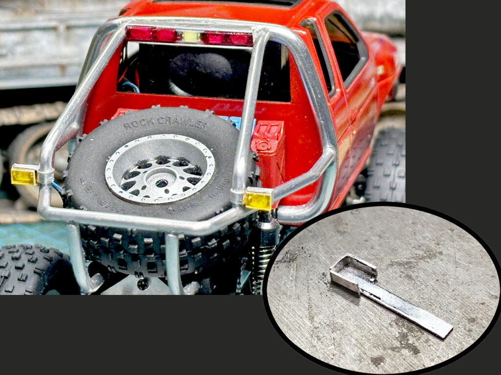 さらにリア用のウインカーパーツも作ります。コレも同様にアルミ板からパーツを切り出して折り曲げて整形し、LEDチップを取り付けます。リアのフレーム周りにはコイツを取り付ける場所がないので、長く材取りしたステー部分をロールバーに巻きつけて接着・固定するスタイルにしました。これで強度を持たせつつスッキリ取り付ける事が出来ました。最期にクリヤーオレンジを塗ったレンズ部分を接着すれば完成です。