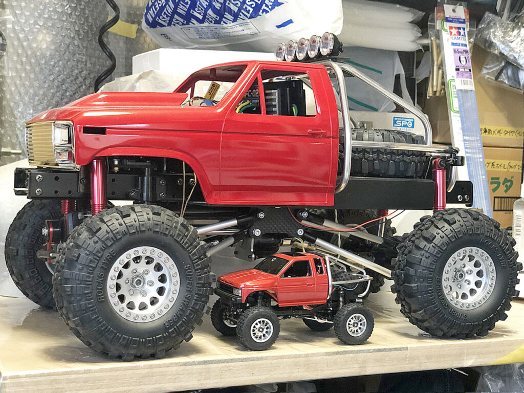 まだ運転席回りの制作が残っていますが、ここで一休み。同じく制作中のもう一台と並べてみます。こちらはタミヤの1/10、F350をブロンコボディーに積み替えたカスタムクローラーです。サイズがこれだけ違うのにどちらもフルファンクションで遊べます。しかもブロンコは3段変速付き。ブロンコの方はこれから電装系の仕上げに入るところです。