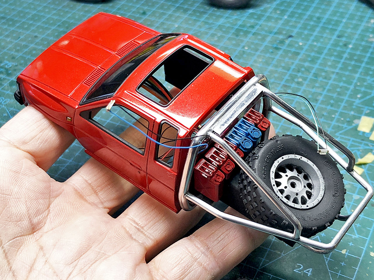 こんな感じになりました。ホイールがアルミ削り出しになったので、急に高級感が出ました。複製タイヤのホイールもシルバー塗装したので本物っぽいです♪車体側にはすでに受信機やスピーカーを積んでありますが、キャビン後方に縦積みにする事で運転席の空間は確保してあります。さすが、キングキャブ!