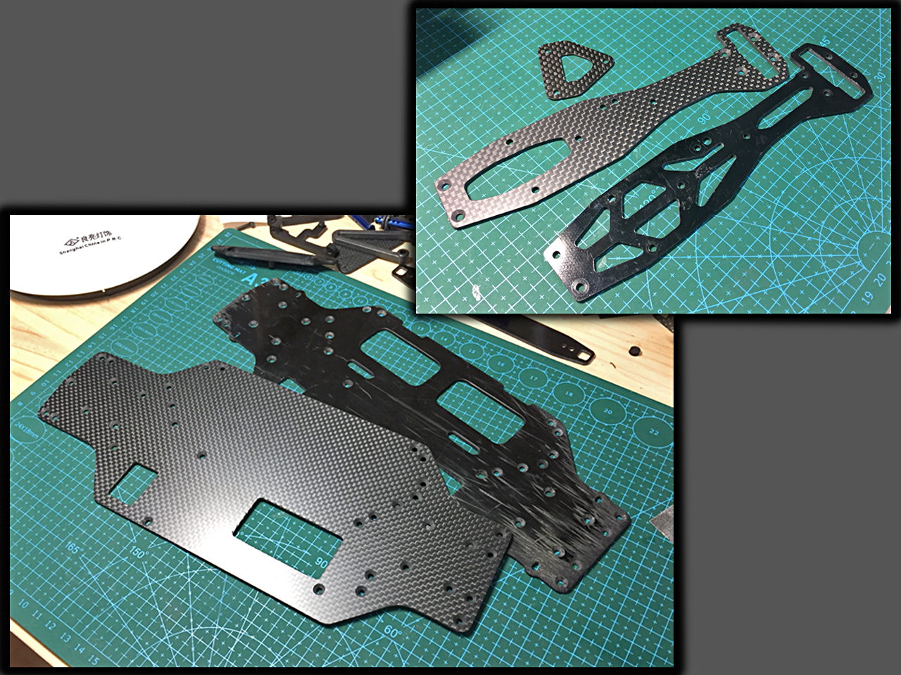 このジェネティック。シャーシ、アッパーデッキともにブラックFRPがキット標準でした。以前のパーキングロット走行でこのシャーシ下面がガリガリに傷ついているのがずっと気になっていました。そこで、キレイなカーペット路面走行に備えてこの機会にカーボン化してしまいます。どちらも2mm厚のドライカーボン板から切り出してビス穴には皿加工しておきます。さらにフロント用ショックマウントの補強パーツも作ってみました。