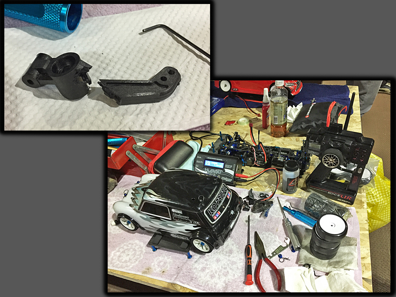 4回目のインコムアリーナ。今日はコース脇のテーブルに陣取って準備を進めます。今回もバラクーダとジェネティックの旧車2台体制で。どちらもタイヤには前日の夜にグリップ剤を塗っておいたので、もう一度軽く塗ってから拭き取ってコースイン。まずは1号車、バラクーダから。いつも出だしのグリップがイマイチで安定しないので慎重に。途中バックストレートで車両右側をフェンスに当てたので一周してからいったん回収。あれ?タイヤが変な向きに。「マジか!」前回交換したばかりのリアナックルがボッキリ、カーボン混入のハードパーツなのに。この影響でドッグボーンが暴れてナイロンのデフキャリアも割れてます。もう、全ての樹脂パーツが脆く劣化してます。