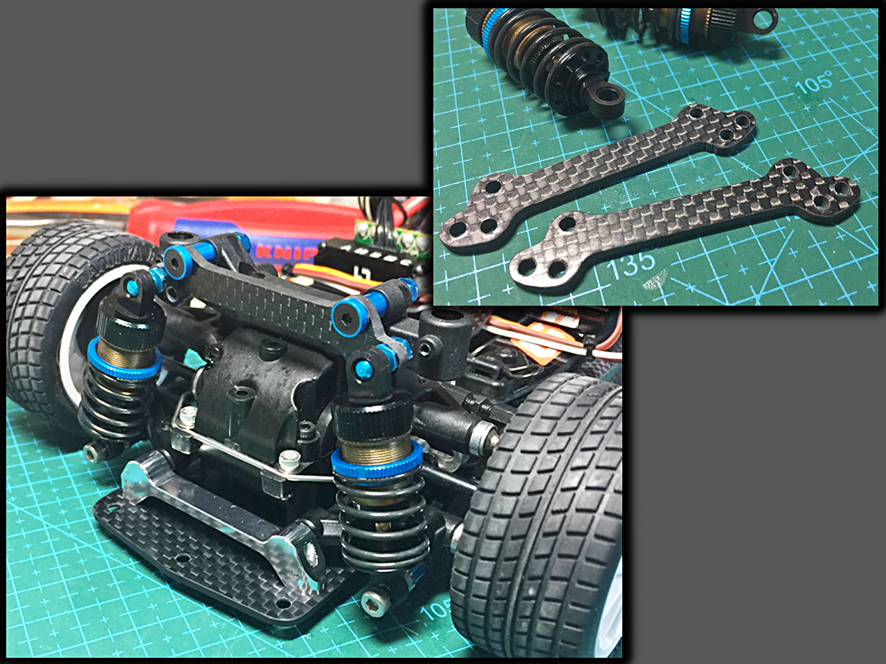 せっかくのショートダンパーなので、そのボディー自体を低く搭載したいです。そこで3mm厚のカーボン板からダンパーステーを切り出しました。オリジナルのアッパーピボットからコレを「吊る」かたちで固定します。従来のアソシ製に比べてやや大きくなったダンパー径やスプリングリテーナーの形状の違いで、サスアームやリアのトルクロッドに少し干渉してしまいます。これは、取り付け穴の位置を変えてダンパーを立てたり各部のスペーサーの厚みを増やして対策します。これでダンパーボディーを今までより10mm以上低くマウントする事ができました。