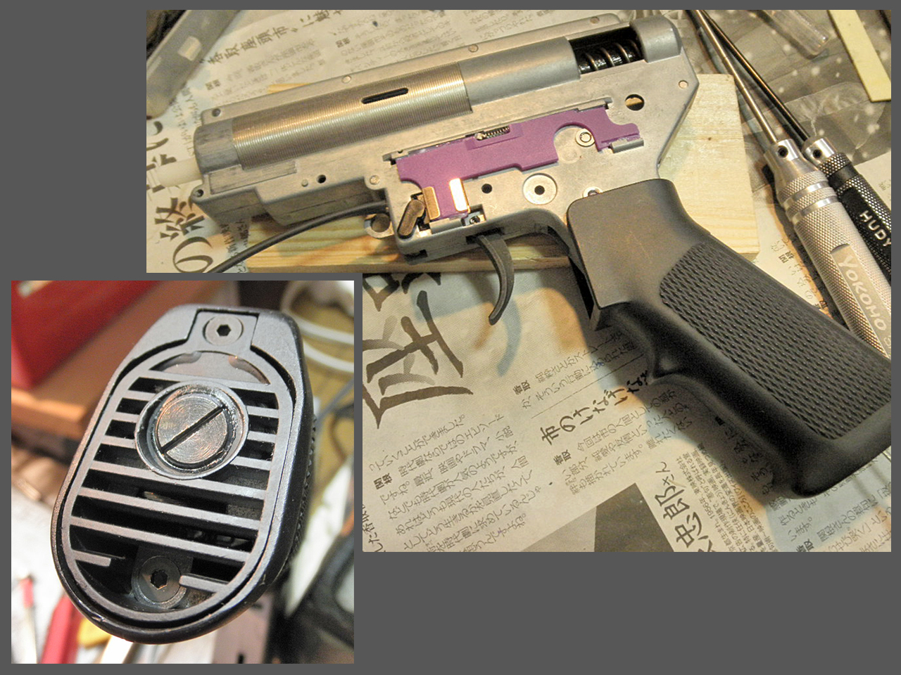シリンダーは「ライラクス」の250mmバレル用、シリンダーヘッドはジャンク箱からマルイ純正品を。