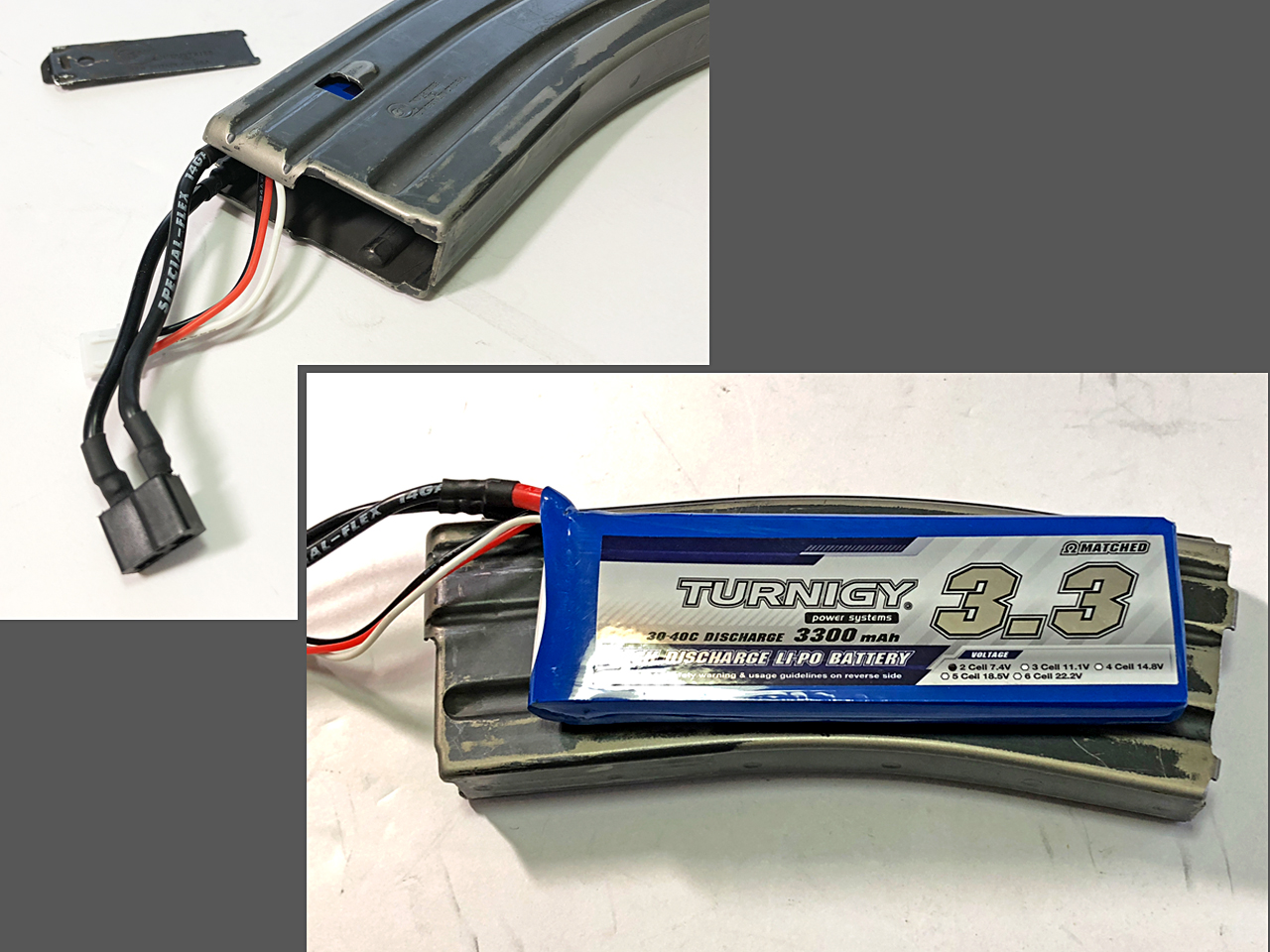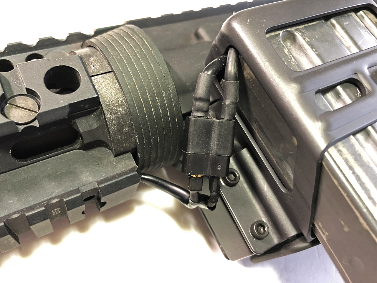 GUN本体側のワイヤー、コネクターも全て黒くして目立たない様にしておきます。バッテリーマガジンをレディマグに装着して、電源を接続した状態がコレです。まぁ。配線が目立つといえば目立ちますが、わりと上手く出来たので気に入ってまス。