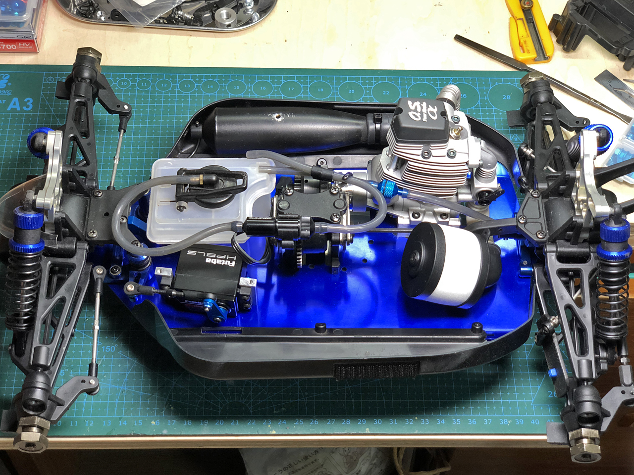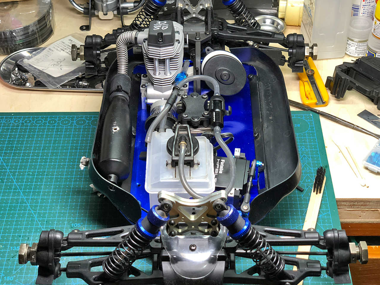 全体のレイアウトはこんな感じです。シャーシ左側の空いたスペースには受信機、スロットルサーボと電源バッテリーを搭載します。