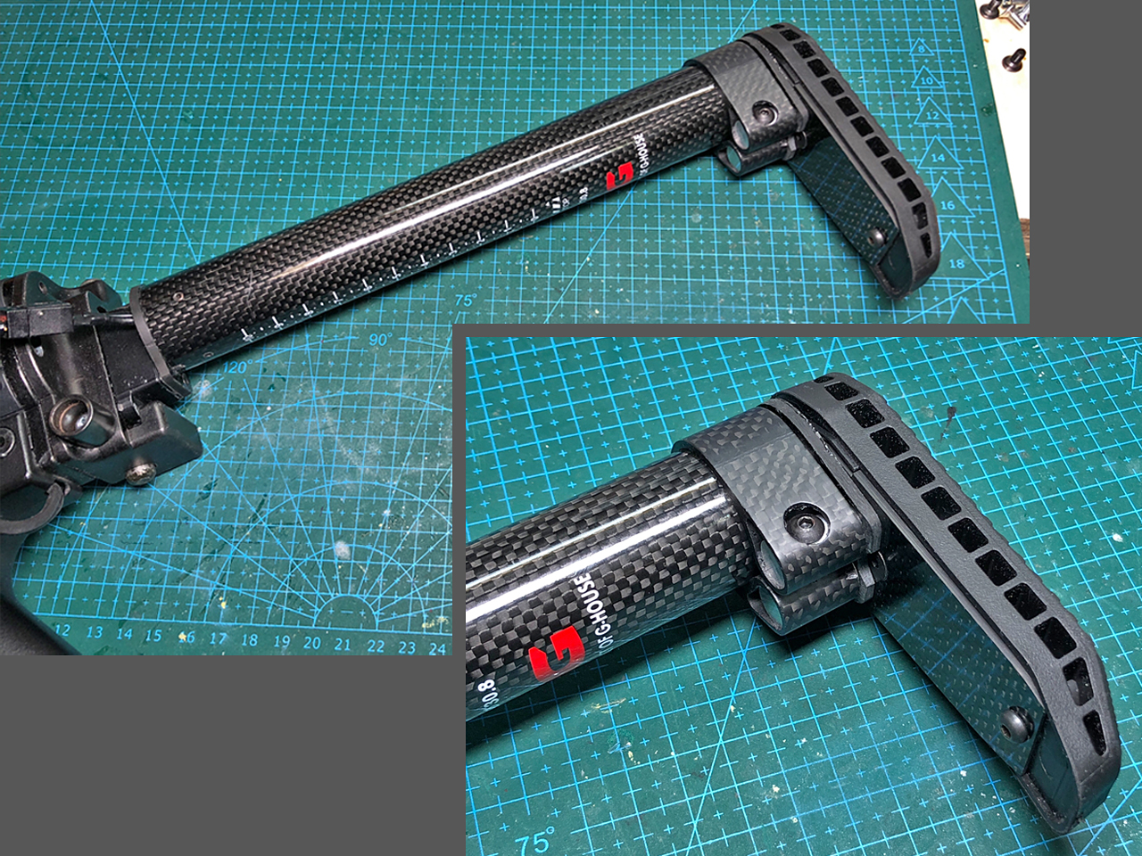 ストックパイプに取り付けるとこんな感じです。もともと人間の体重を支える為のパーツなのでガッチリ締め付ける事が出来ます。パイプの目盛りはシートポストがどれぐらい自転車のフレームに入っているかを把握する為のものです。GUN用には全く必要ないんですが、何となく残しました。ストックの基部はマルイ純正のPDW用なので、もちろんこのまま折りたたむ事が出来ます。