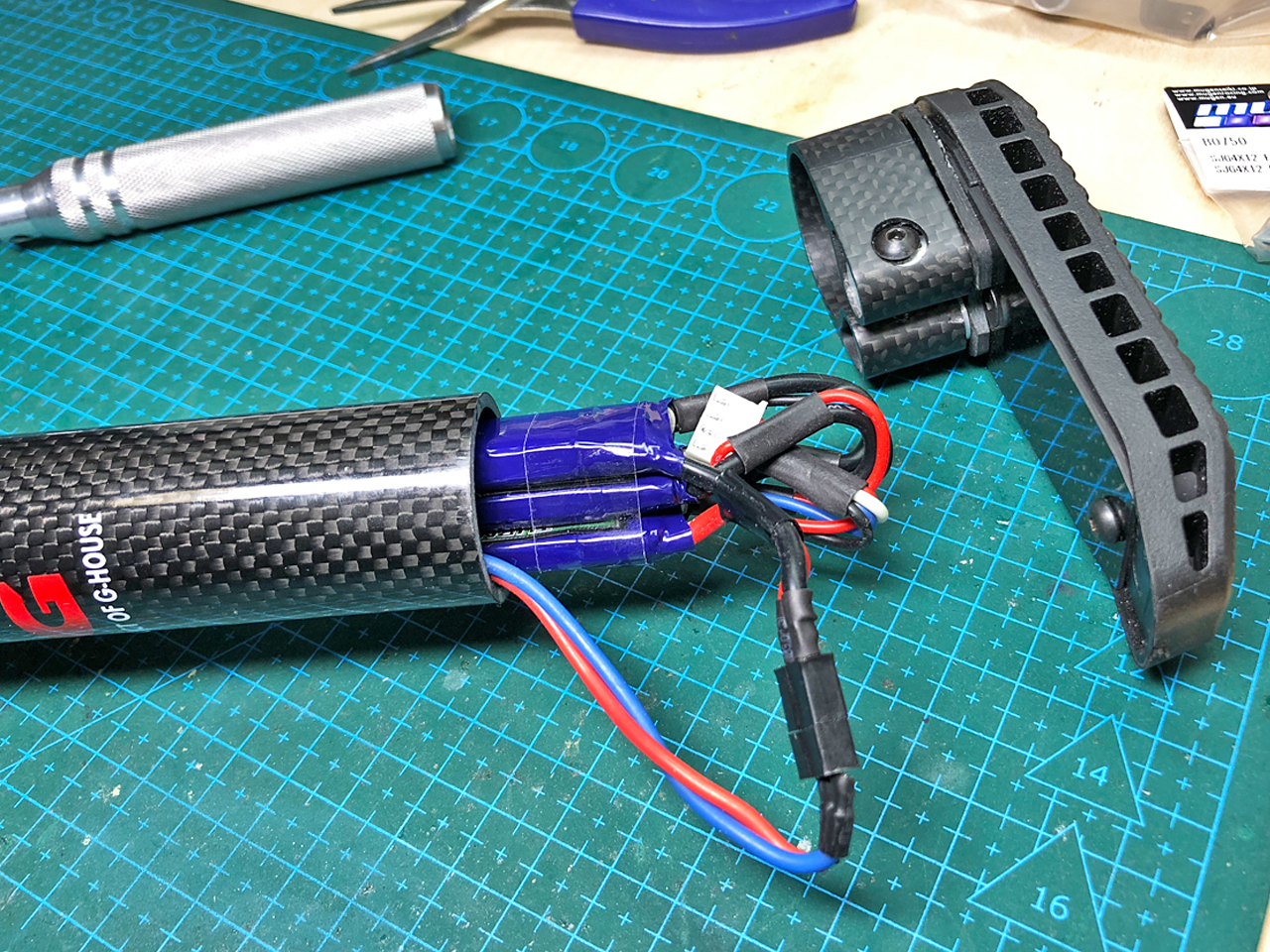 バッテリーは1,300mAhのリチウムポリマーを3セル、11.1vまで入れられます。ただしコネクターはディーンズタイプのミニサイズに交換する必要があります。バッテリーの交換はクランプのM4ビス1本を緩めるだけで出来るので、ノーマルよりも断然シンプルです。