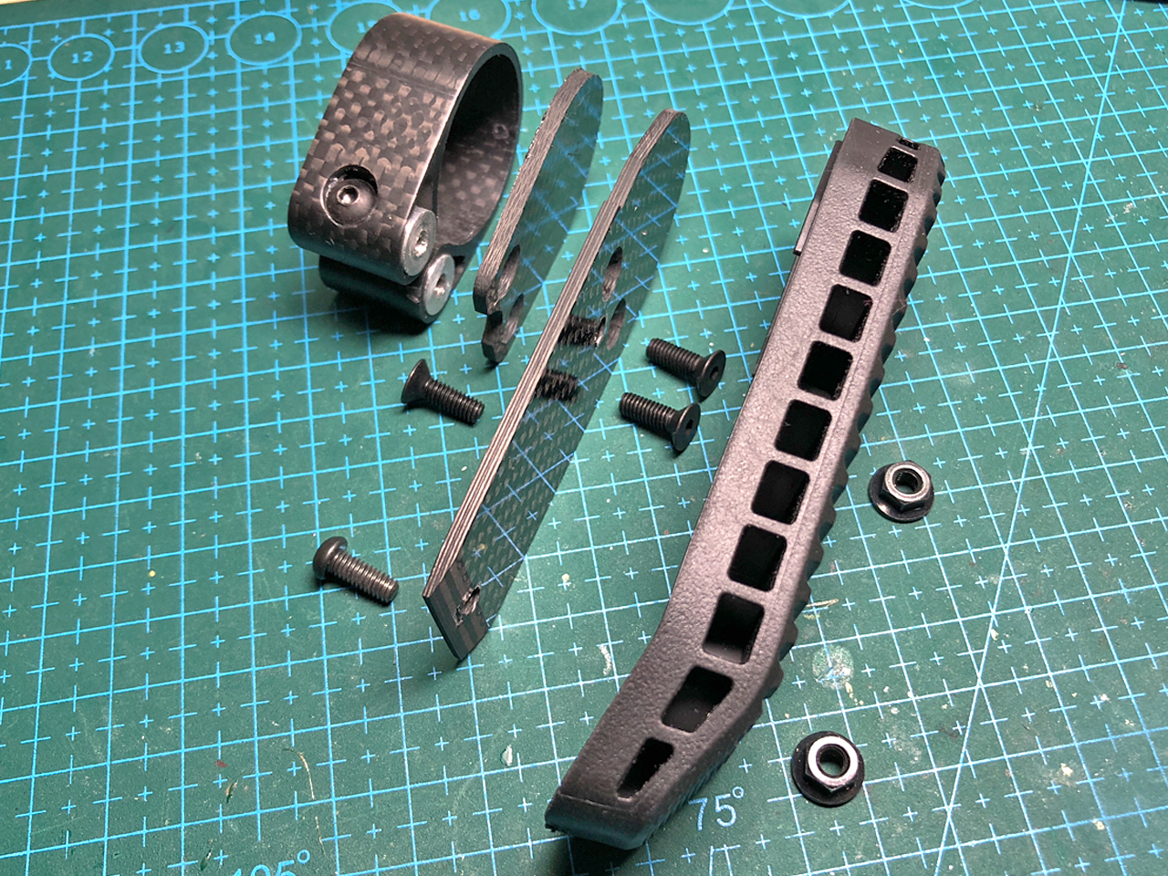 アキバのエチゴヤで買ったマグプル風バットプレートをこの構成で固定します。間にカーボンプレートから切り出したスペーサーと固定用ベースを挟んでそれぞれビス止めします。ちなみにビスとナットはラジコン用のブラックカラーで統一しました。