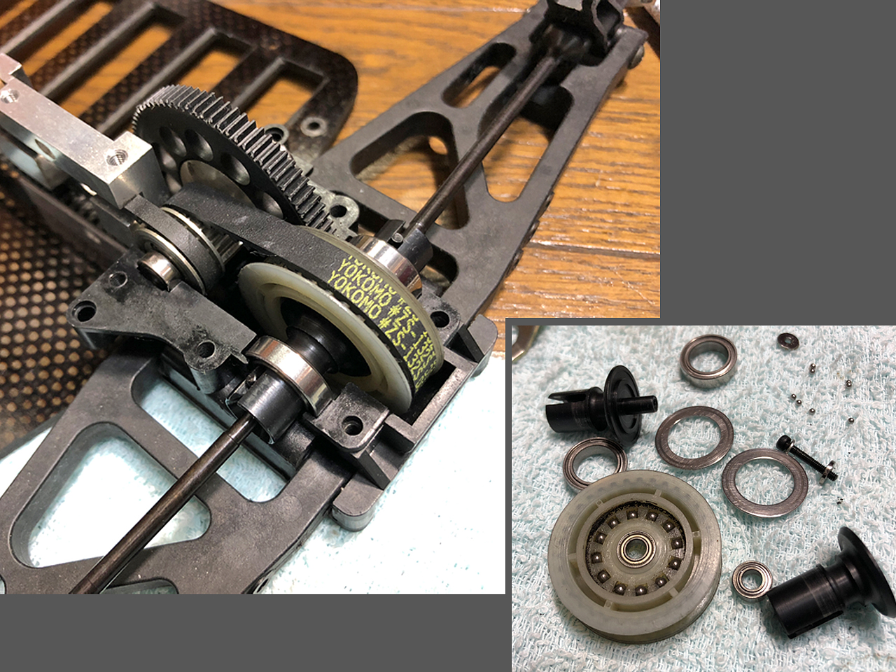 さっそくリアベルトを装着します。このクルマ、リアセクションのレイアウトが凄くタイトで、シャーシに沈み込むスパーやプーリー部分のクリアランスがギリギリです。ココに小石が挟まるとギア舐めやベルトの断裂につながるので、対策を考えます。この機会にリアデフの10年前の汚れを落としてメンテしておきます。
