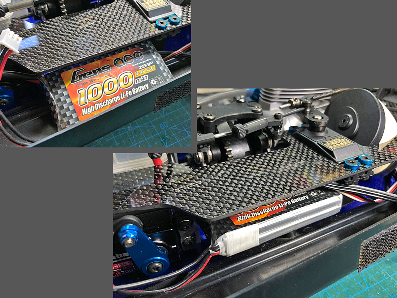 スロットルサーボの位置をもうちょいセンターに寄せるべきでしたが、スロットル/前後ブレーキの各リンケージが一直線に出来たので良しとします。