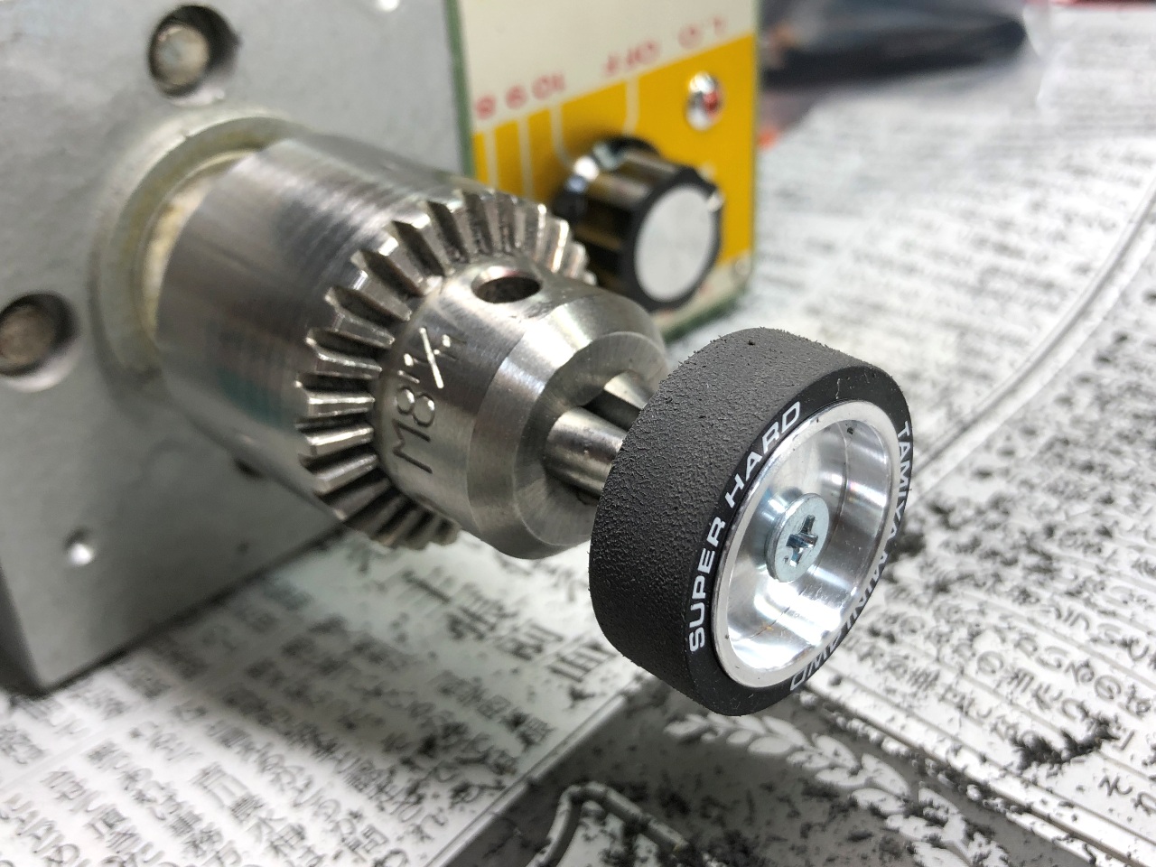 そうそう、いつの間にか装着されていますが。ネットで先輩方のマシンを研究しているときにコイツのホワイトレターがカッコいいと思って。タミヤのスーパーハード大径ローハイトタイヤ。定価を知らずに「ミョーに高いな」と思いながらもネットで購入。後で、レアもの高価格なのを知りました。インジェクション製品なのでトレッド面にゲートと「湯ジワ」が。なので、ホイール装着状態で外径30mmまで削りました。