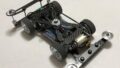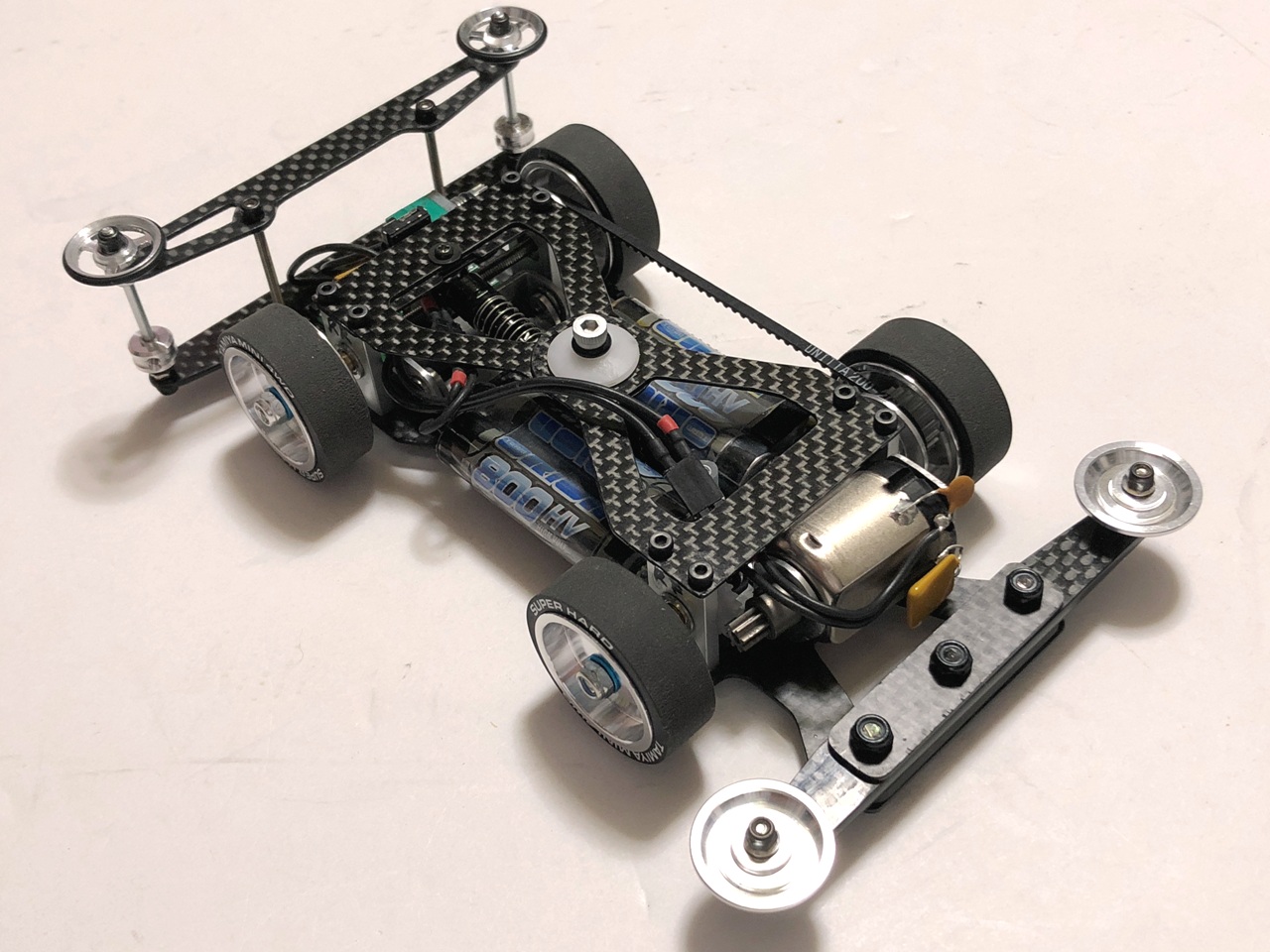 ひとまず車体は完成です。モーターレイアウトはサイドワインダーにしましたがスパーギアの径が少々小さく、アクスルシャフトとモーターマウントが干渉してしまいました。なのでモーターを少し斜めにしたアングルワインダーにしてバックラッシュを調整してます。ちょっとスロットカーみたい。全然ちがうし・・・。でもなんか異様なムードなのは気に入ってます。