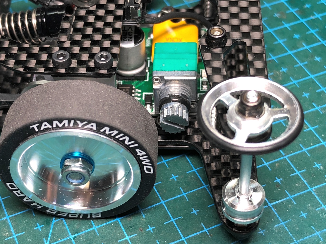 スピードコントローラーはリアの車軸後方に搭載しました。樹脂製のダイアルつまみを外してしまったので、マイナスドライバーで調整します。立体コースのジャンプで飛び出さないように低速から始めて、ちょうどイイ回転数を探していきます。電源のオンオフ自体はスライドスイッチで行います。