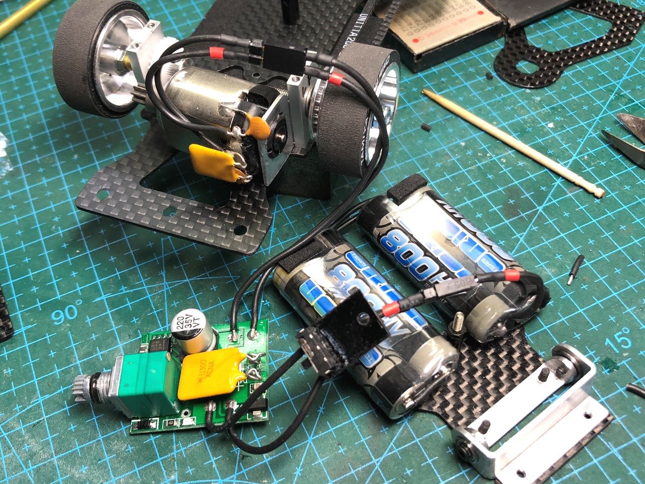 パーツの搭載が終わったので、いったんバラして配線していきます。バッテリー→スライドスイッチ→スピードコントローラー→モーターの順で接続します。充電器に接続しやすくするためにバッテリーには極小の2ピンコネクターを取り付けました。モーターにも同じものを取り付けてメンテ時の着脱に対応します。