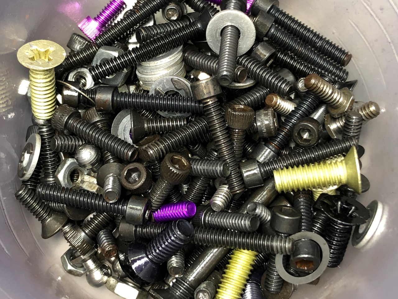 ビス類はサビが浮いているものもあるので、全て洗浄してからクレの5-56を吹いておきます。ナゼかトリニティー製と思われるパープルのアルミキャップビスが数本紛れていました。