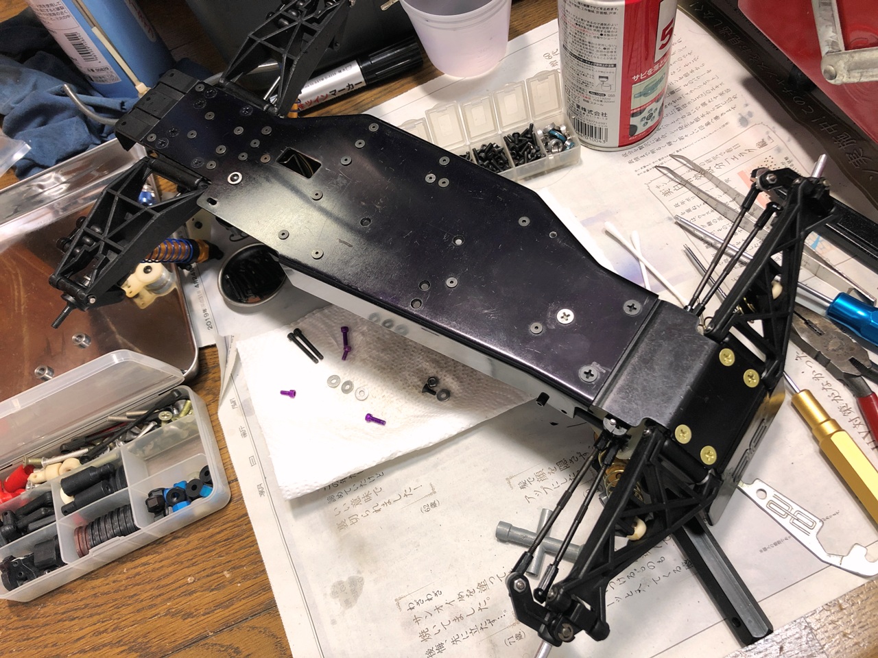 シャーシ周りの組み立てが終わりました。バスタブシャーシや分割式のフロントスキッドプレートには大きなキズが一つもありません。サスアームのヒンジピンや各ターンバックル等のロッド類にも曲がりはありませんでした。