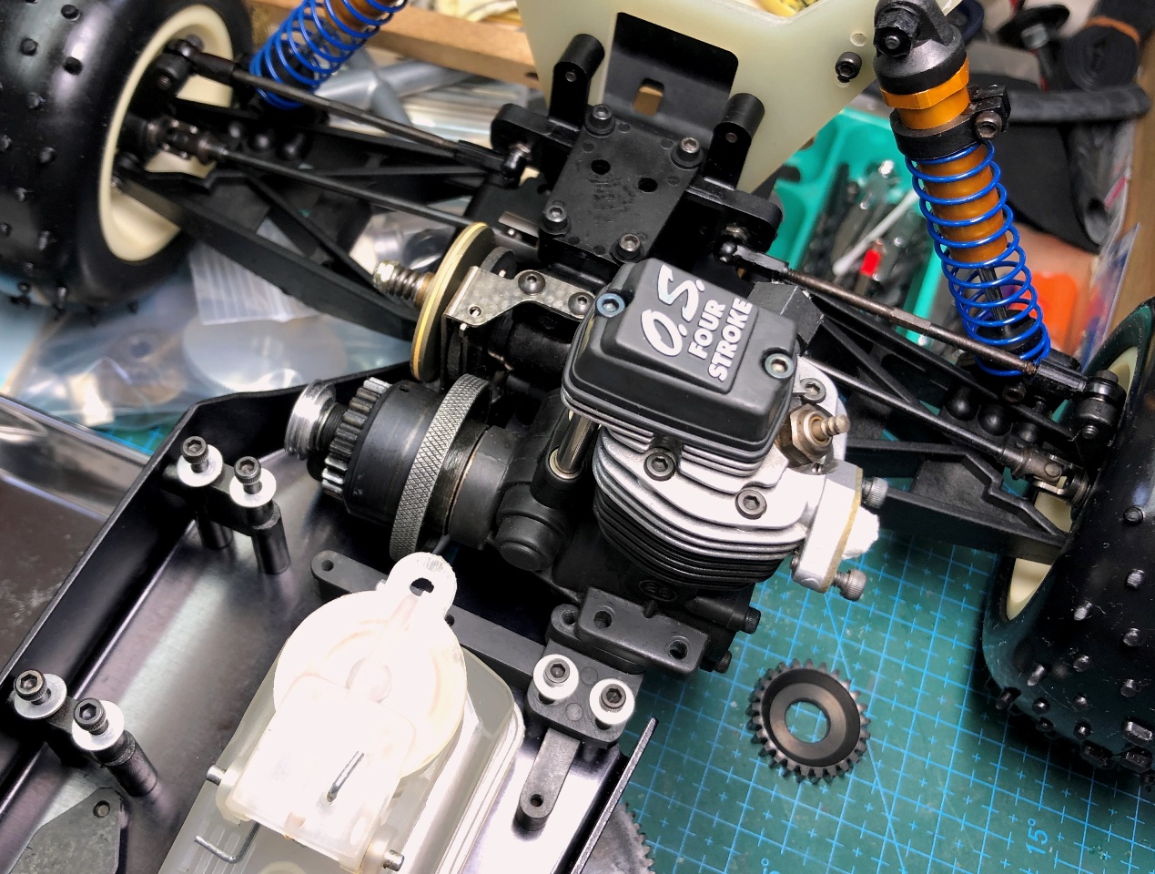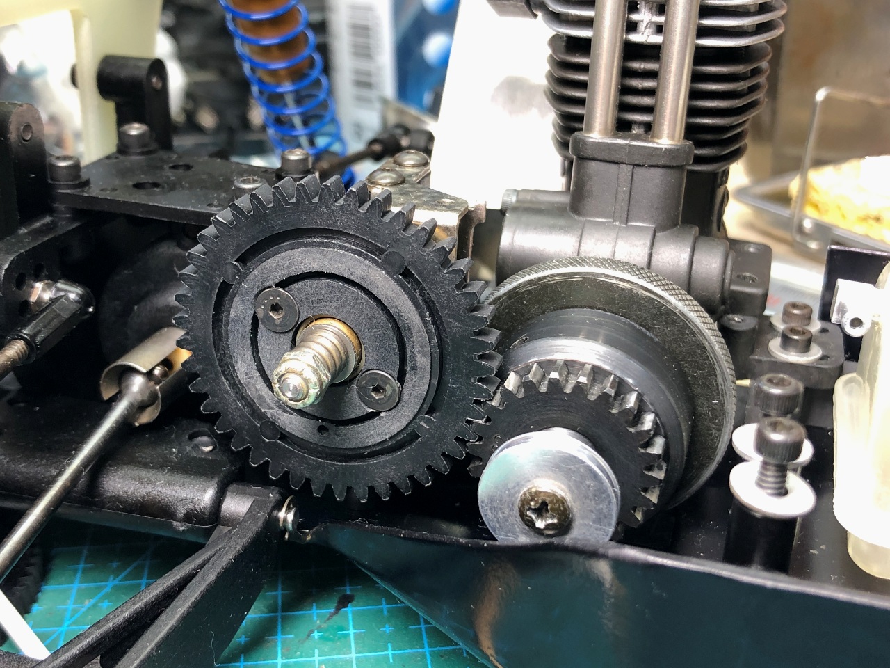 まず、4stエンジンで使っている京商製のピニオンとピッチが違うスパーギアを交換します。
